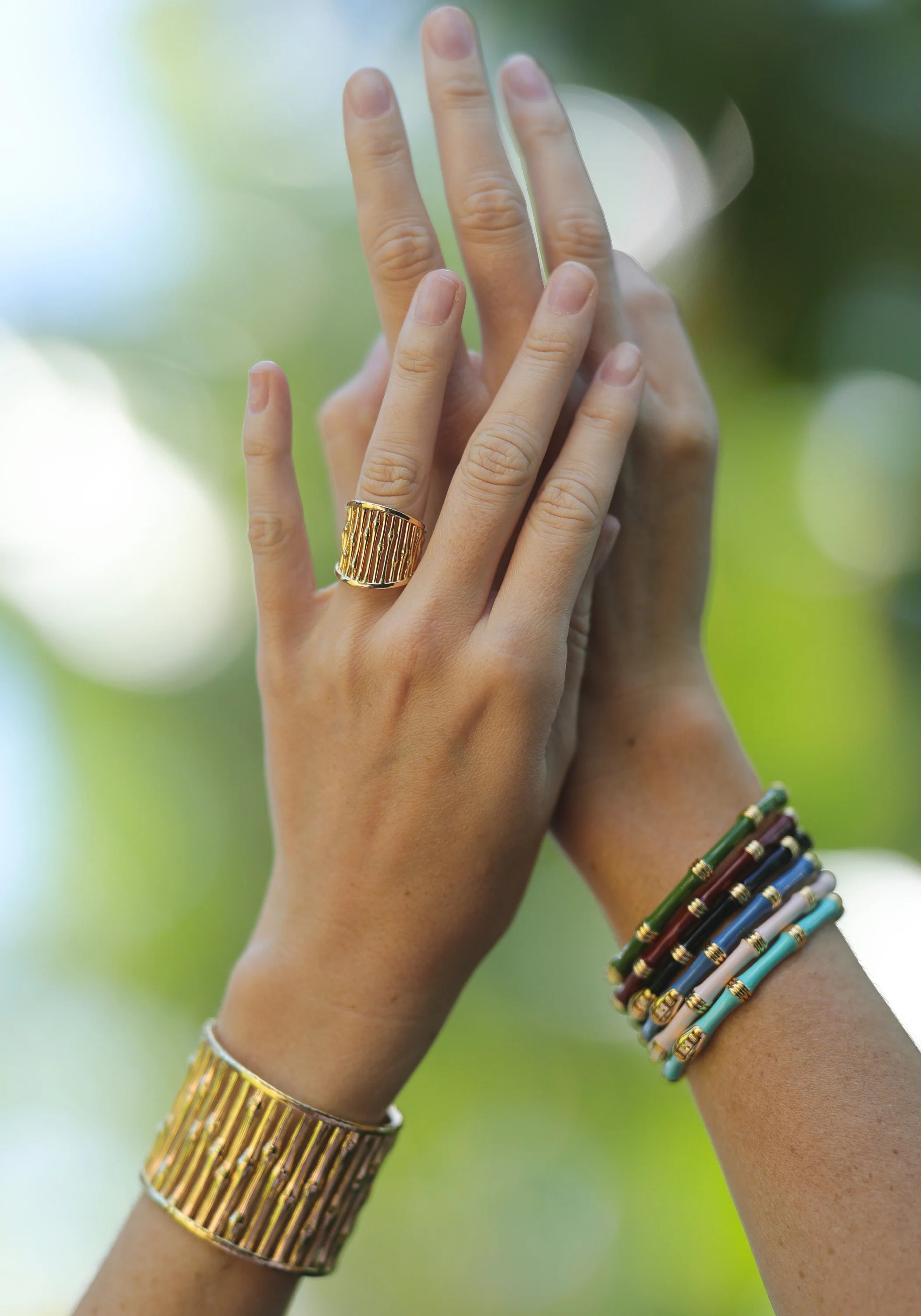 This ring features a micro-hammered outer band which frames a subtle, sculptural bamboo motif. The 18k gold dipped piece, with its exquisitely textured surfaces, is sure to captivate everyone around you and become a favorite in your jewelry wardrobe. It's like a work of art for your hand! Made of 18k gold, the micro-hammered outer film gives this ring some serious style. Chic and unexpected, it's the perfect conversation starter.