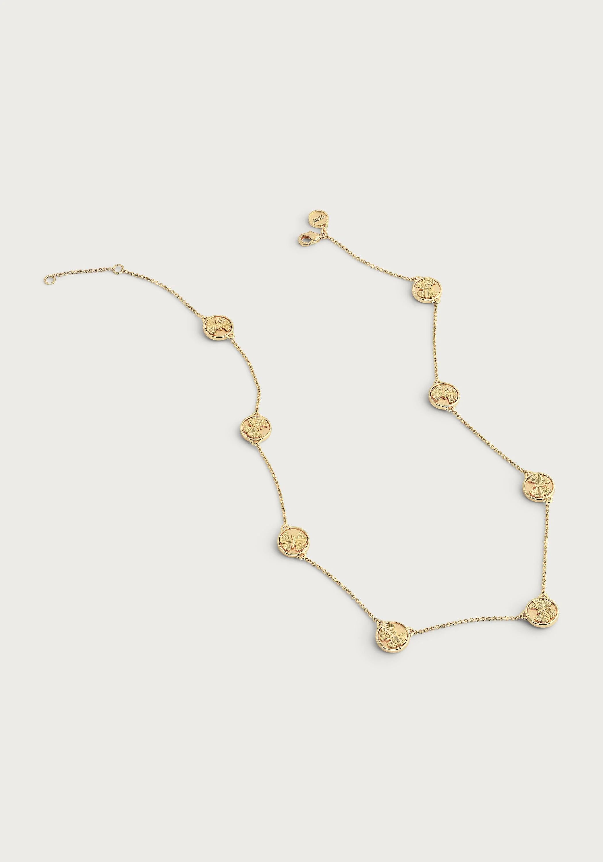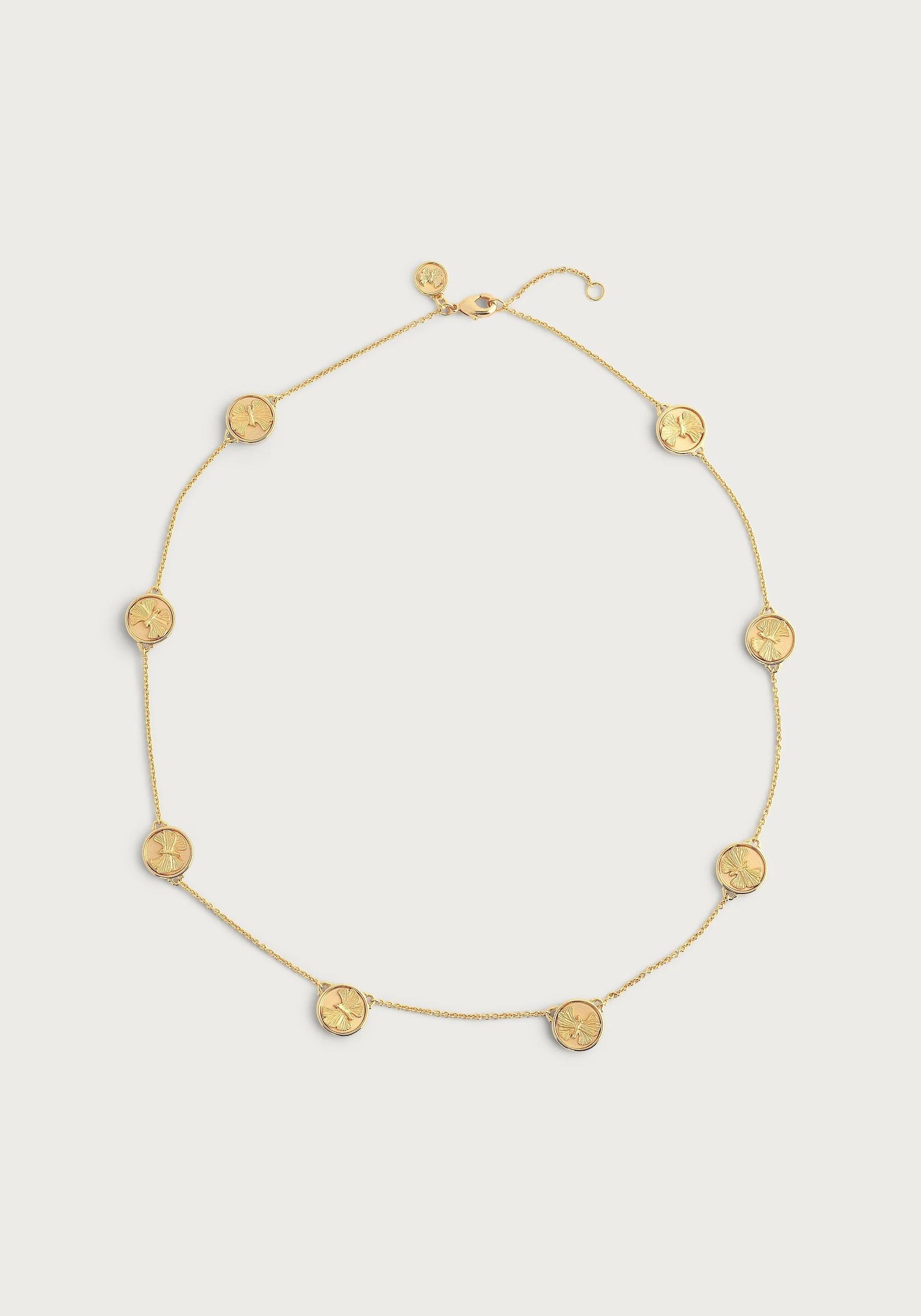 Exquisitely crafted from 18k gold dipped brass, this necklace features petite butterfly coins emblazoned with Anabel Aram's signature butterfly motif that is adjustable in length. A delicate statement piece that embodies the signature motif of Anabel Aram's exclusive collection. Each butterfly coin is elegantly embossed in 18k gold-dipped brass, offering a timeless and versatile accessory that can be effortlessly adjusted to your desired length.