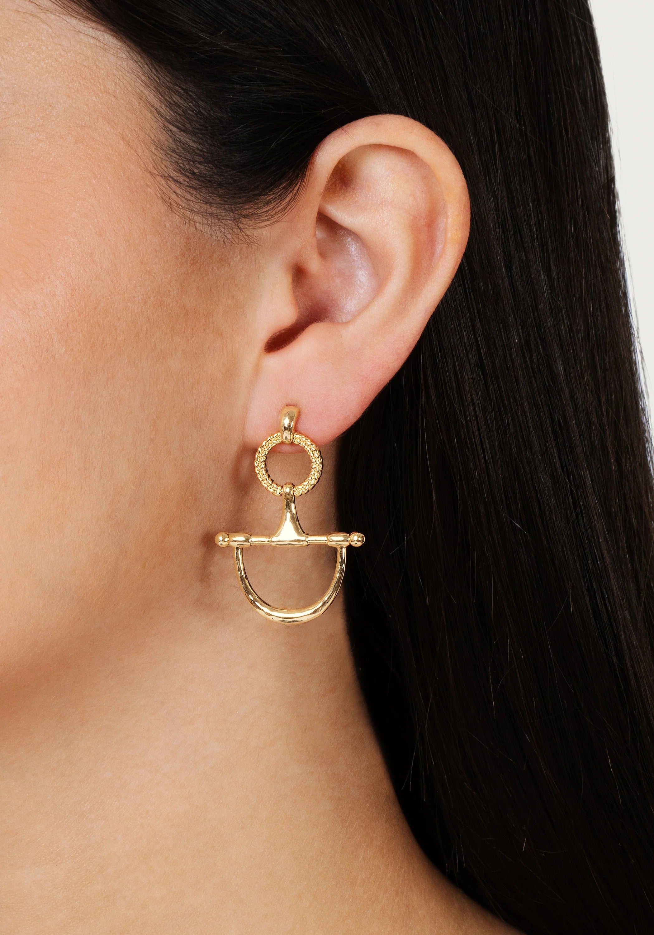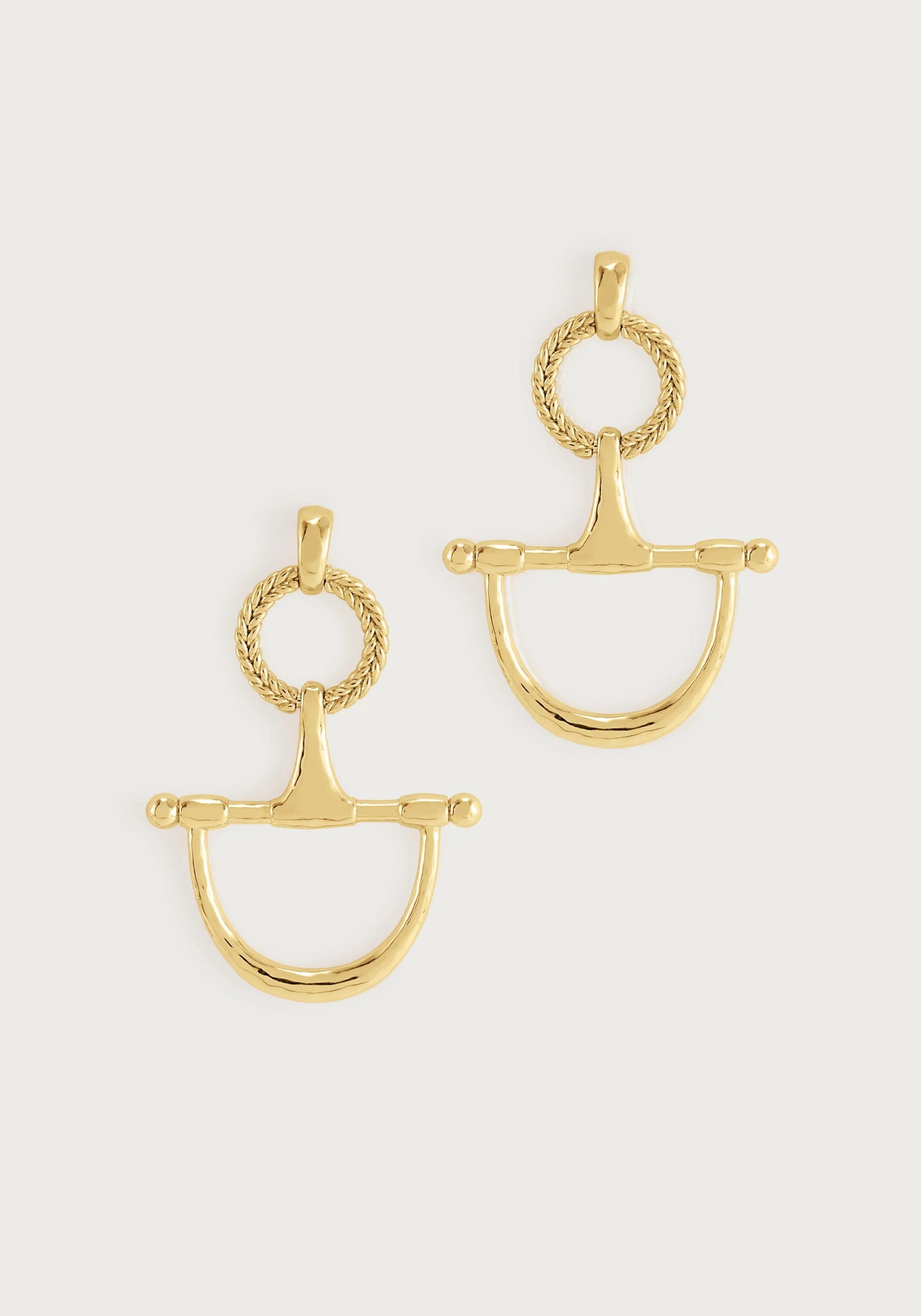 The Cheval Bit Drop Earrings capture the artistry of hand-braided reins and equestrian-style bit with 18K gold plating to catch the light with every movement. This refined piece brings timeless stable elegance to your everyday or evening look.