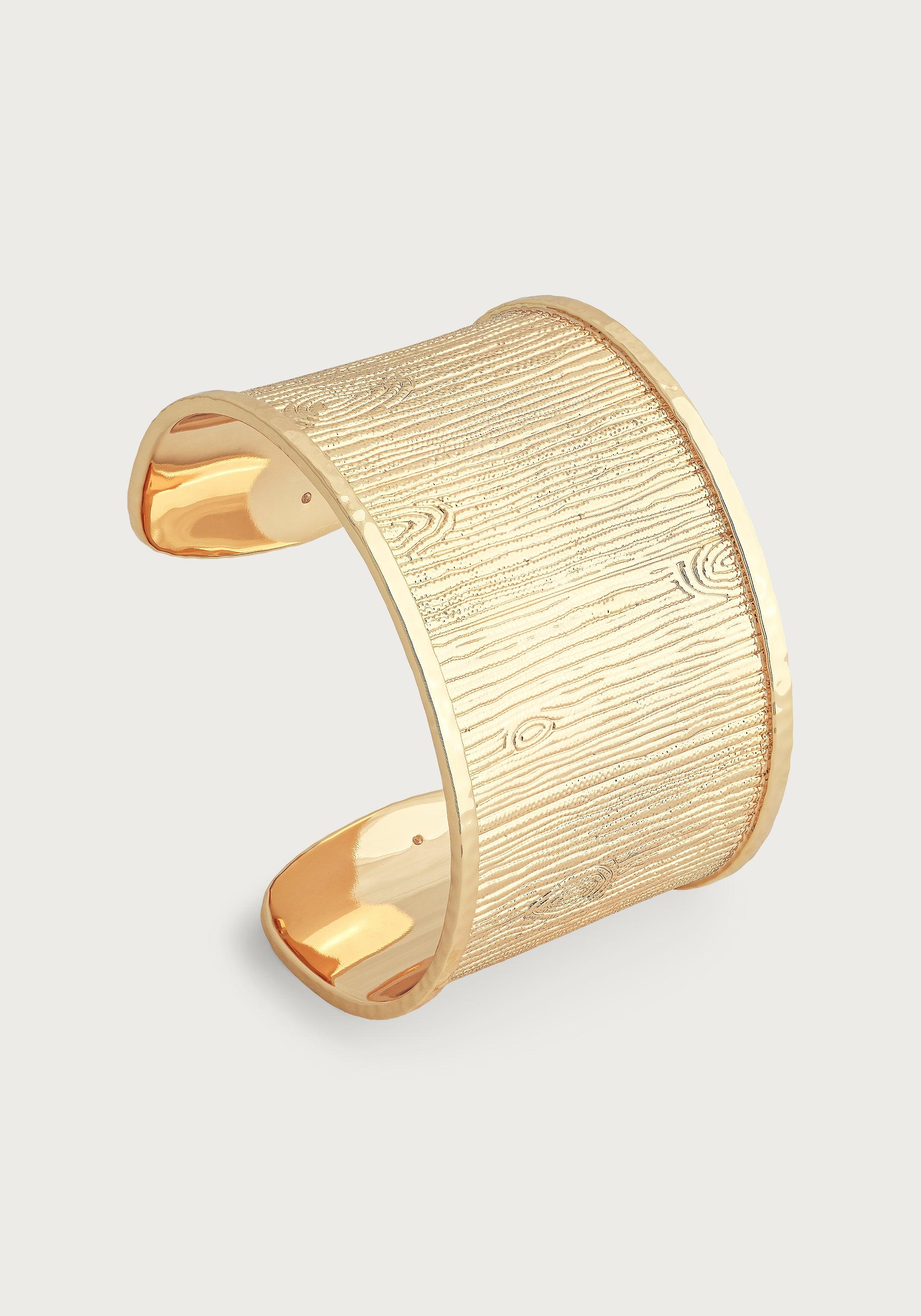 The cuff is flexible for a comfortable fit and showcases an intricate woodgrain design within a micro-hammered outer band. Made with 18k gold plating, this timeless piece boasts beautifully textured surfaces that will catch anyone's eye. Embrace your unique style with a touch of rustic elegance. The cuff's flexible design offers a comfortable fit while displaying an elaborately detailed woodgrain pattern. Its luxurious 18k gold plating and textured surfaces make it a timeless piece that's sure to make a statement.