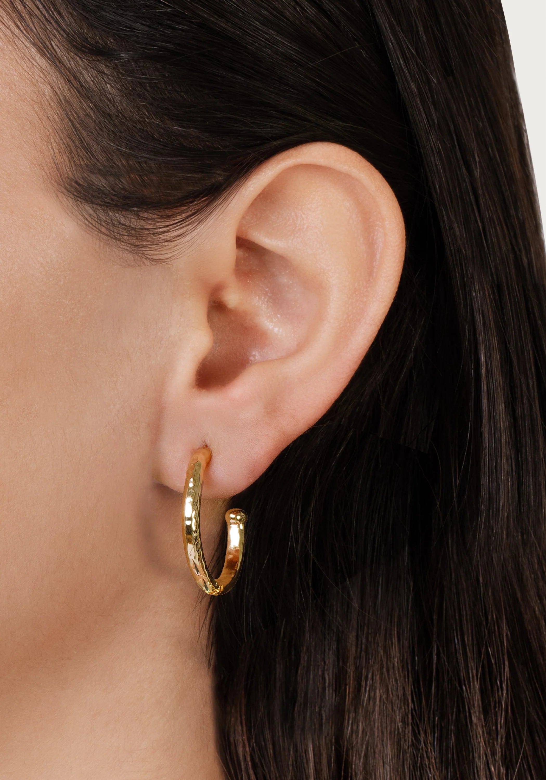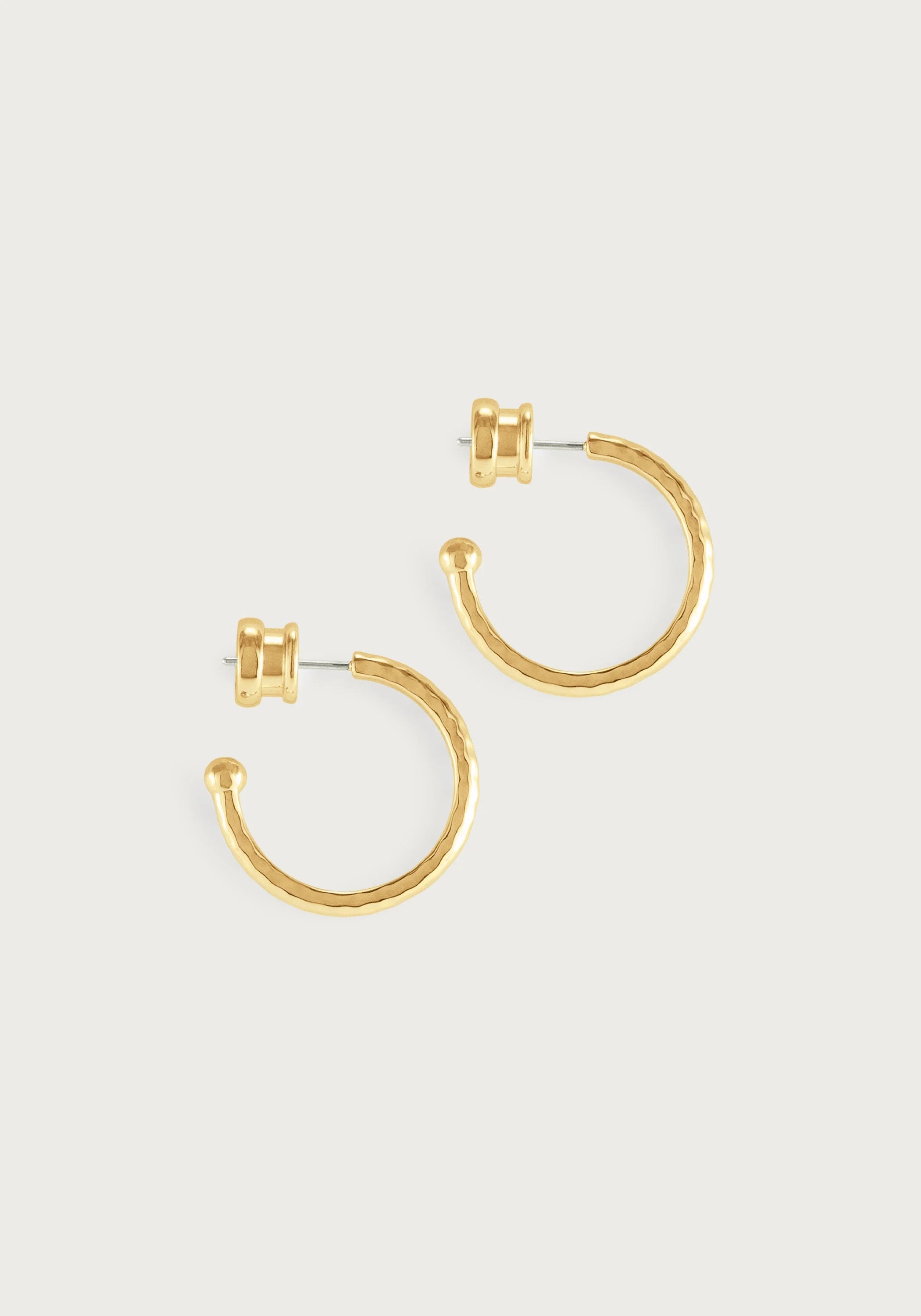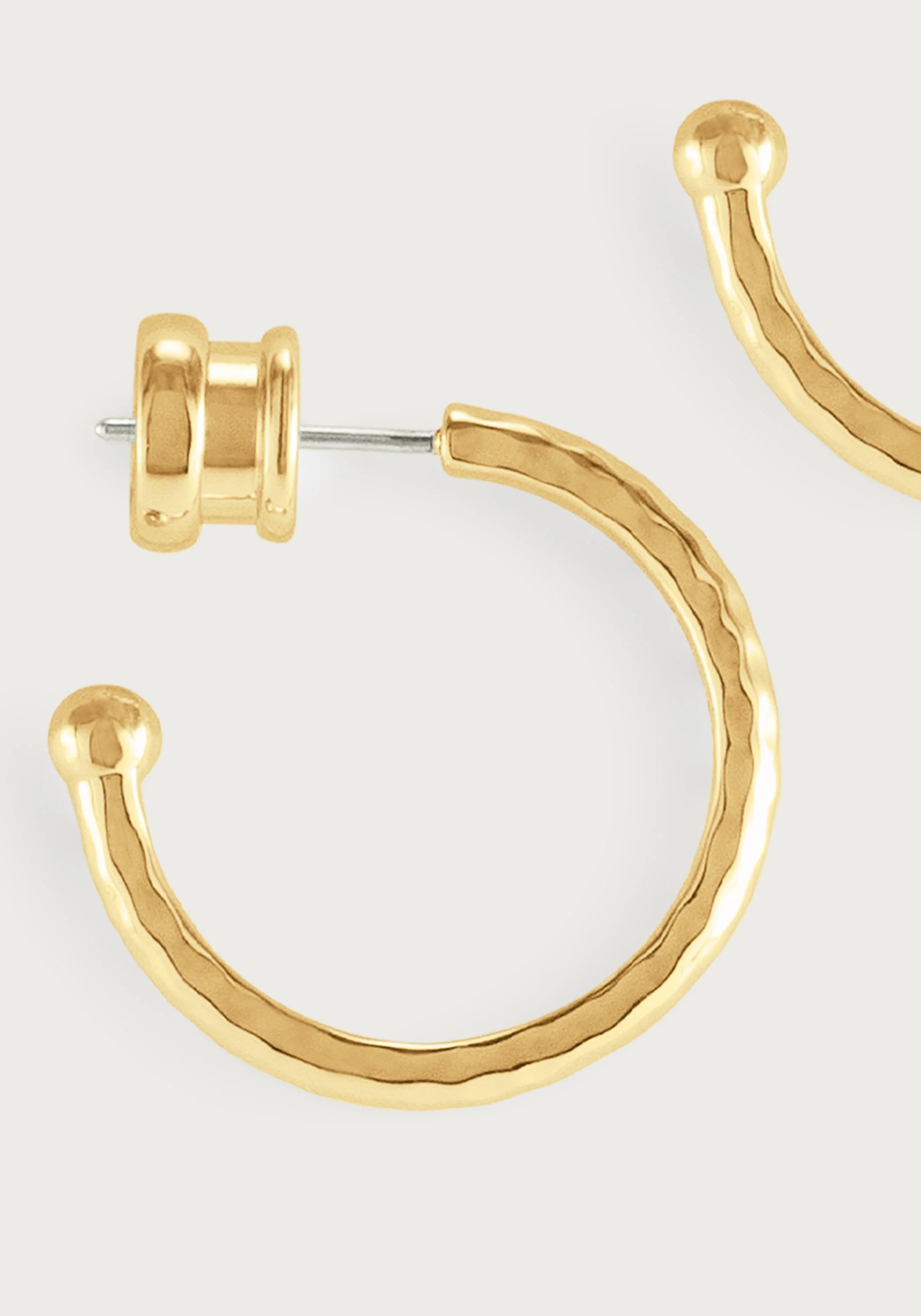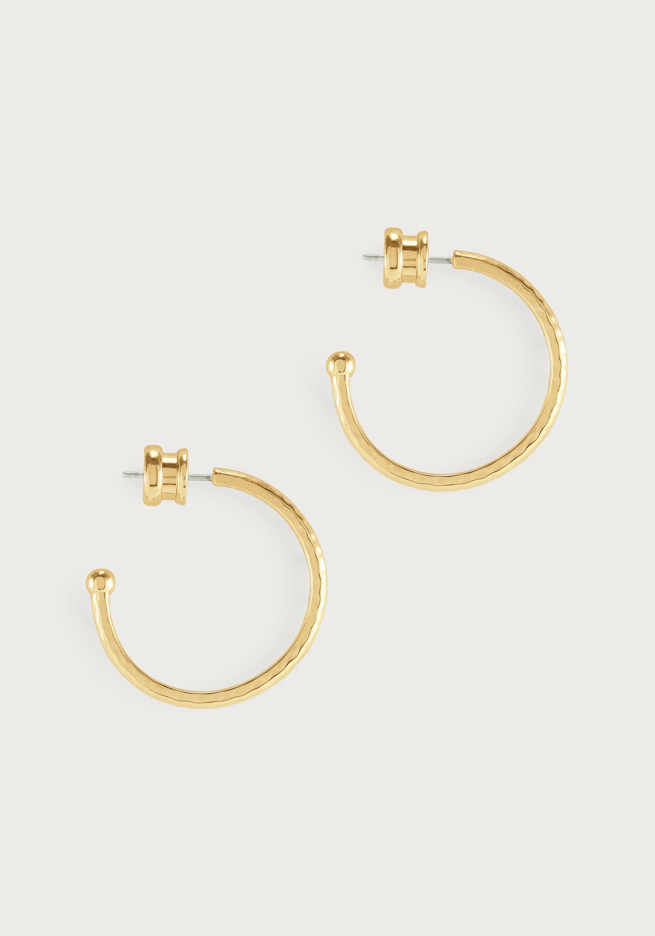 The Farrier Charm Hoop Earrings in Medium is a stunning piece crafted from 18k gold plated brass, designed to add our colorful earring charms to. Each earring features a distinctive hammered texture, echoing the artisanal marks left by a blacksmith's hammer, which gives the exterior a unique, tactile surface. These medium-sized hoops are versatile, perfect for making a statement in both everyday wear and special occasions.
