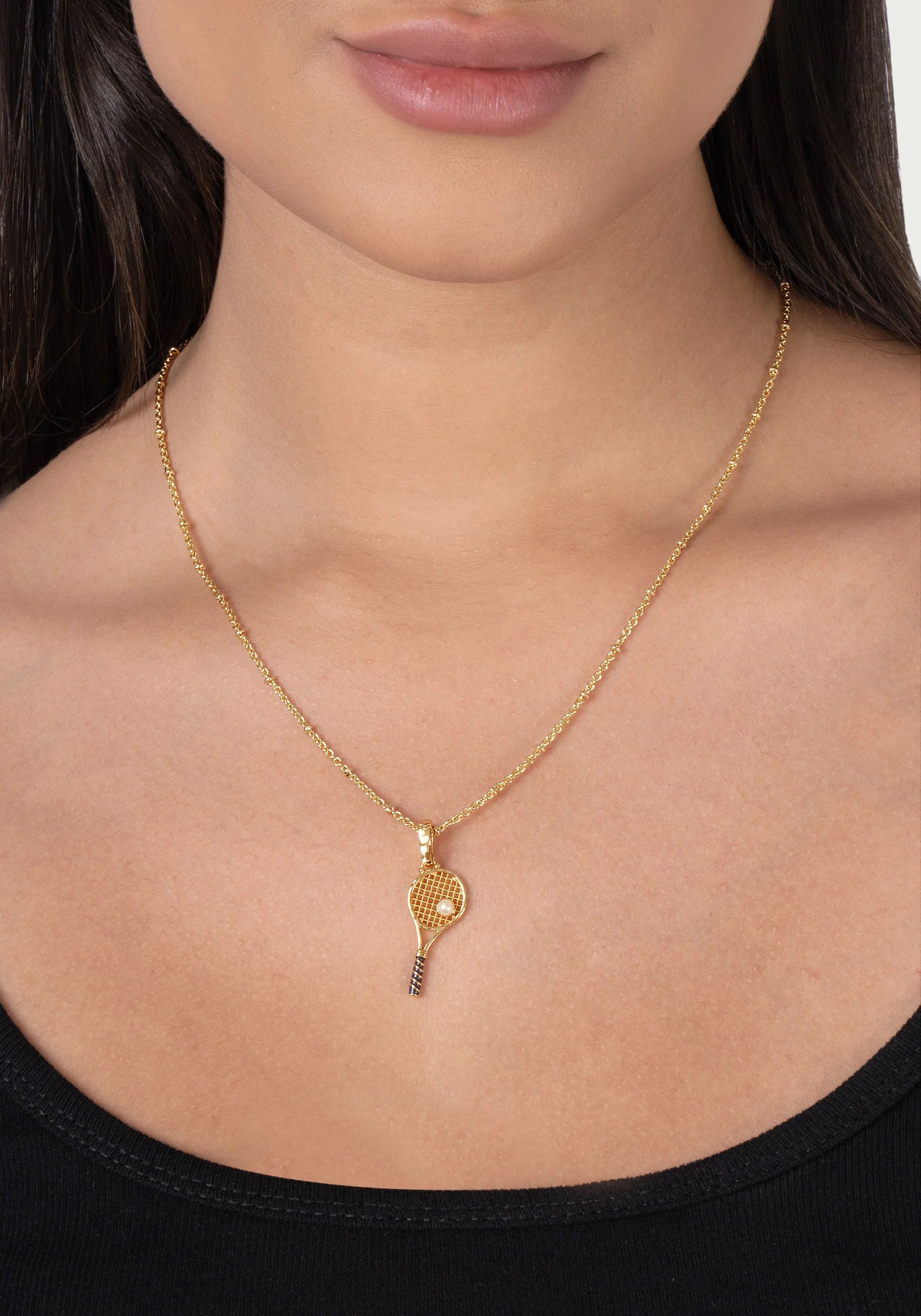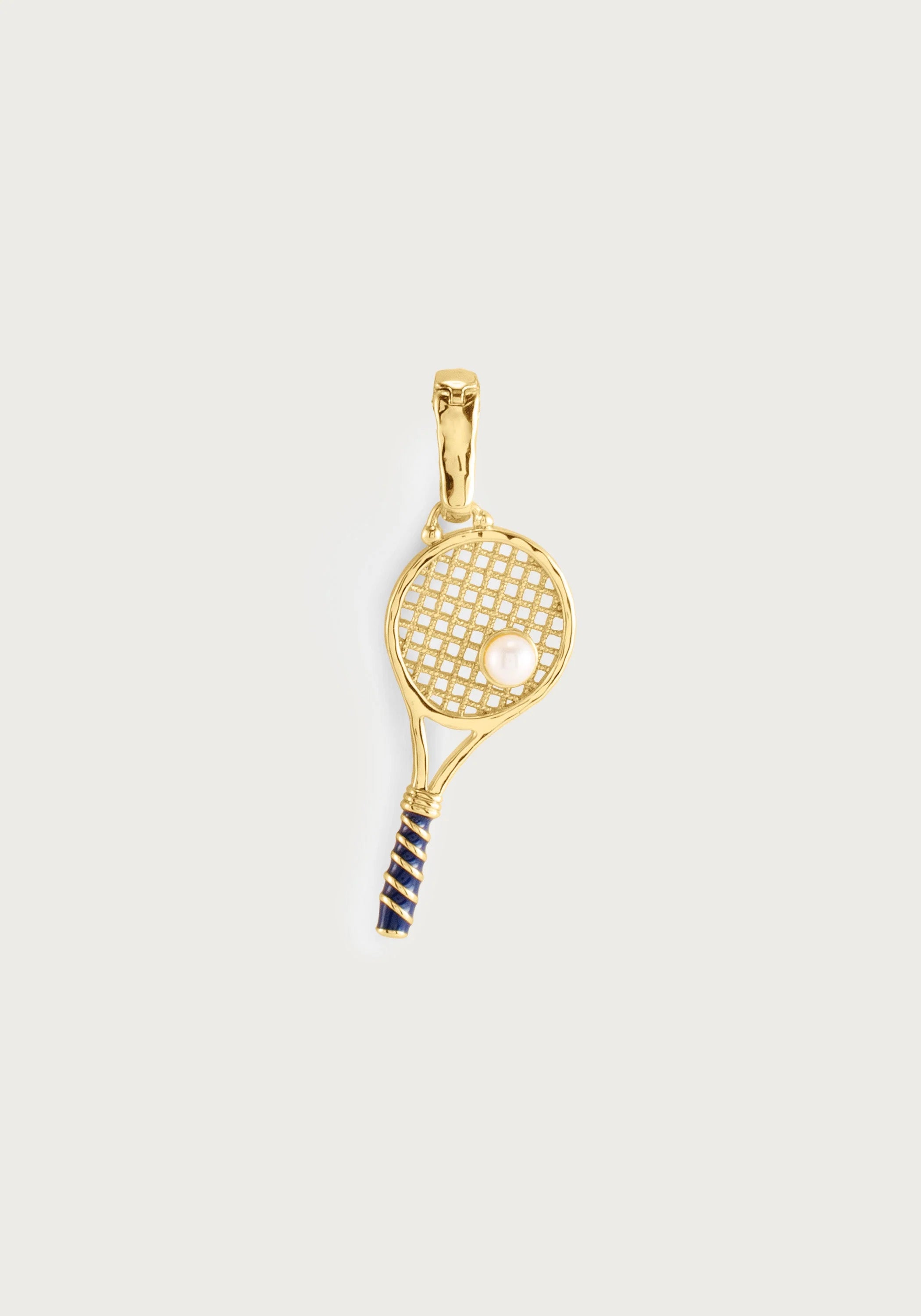 A charming tribute to the court, this whimsical tennis racket is crafted in 18k gold plated brass with a crisp white enamel string bed and a deep navy enamel wrapped handle, capturing every playful detail in miniature. A lustrous pearl sits perfectly at the center of the racket face, standing in as the most elegant tennis ball imaginable. A delightful conversation piece that lets you wear your passion for the game with a touch of effortless glamour.