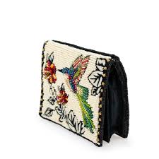 The 'Wing It' wallet is the perfect companion to its matching handbag, featuring a colorful beaded hummingbird in flight, surrounded by vibrant flowers. Perfect for keeping your essentials organized, it adds a lively and elegant touch to your collection!