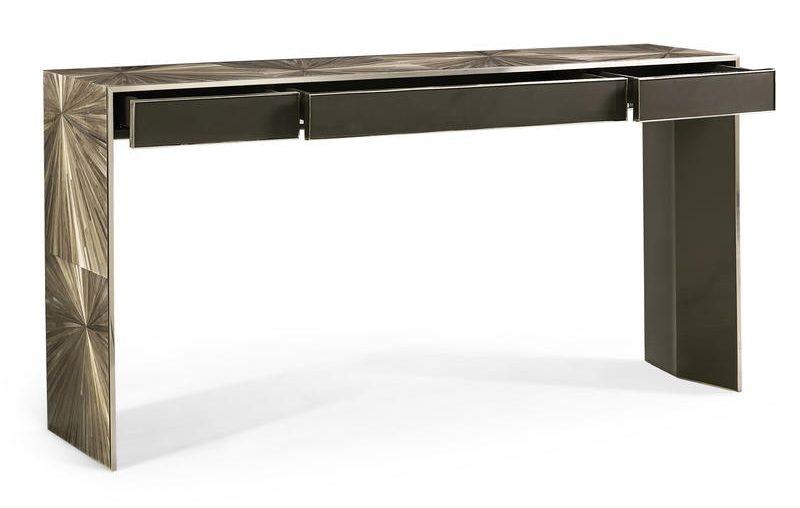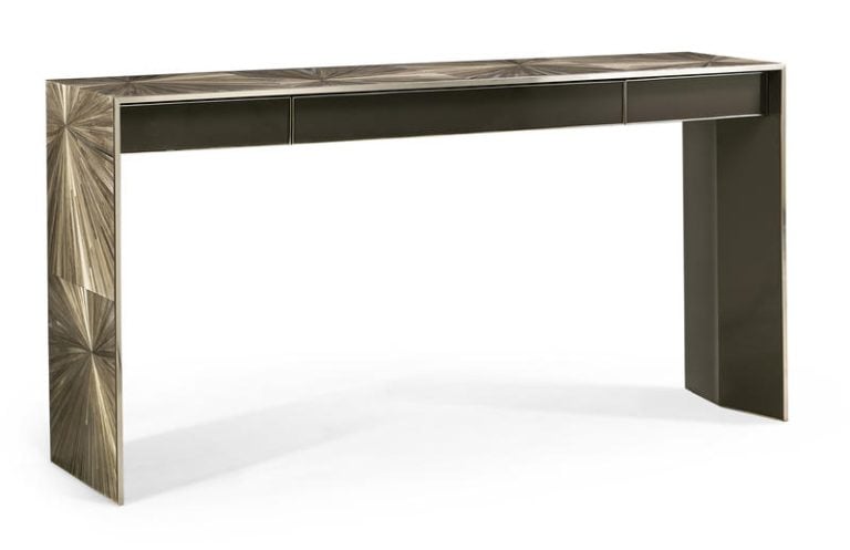 The Terra Console Table is a stunning display of craftsmanship and design, featuring intricate straw marquetry in beautiful natural brown tones. Hand-applied across the entire top, the marquetry creates a mesmerizing pattern, enhanced by a high-gloss finish that highlights its organic texture. The table also includes a discreet single drawer, providing simple storage for everyday essentials. Its base features a lacquered black finish on the inside of the legs, adding a subtle yet striking contrast that gives the piece a dimensional, sculptural feel. With its seamless blend of natural beauty, functional storage, and contemporary elegance, the Terra Console Table makes a refined statement in any entryway or living space.