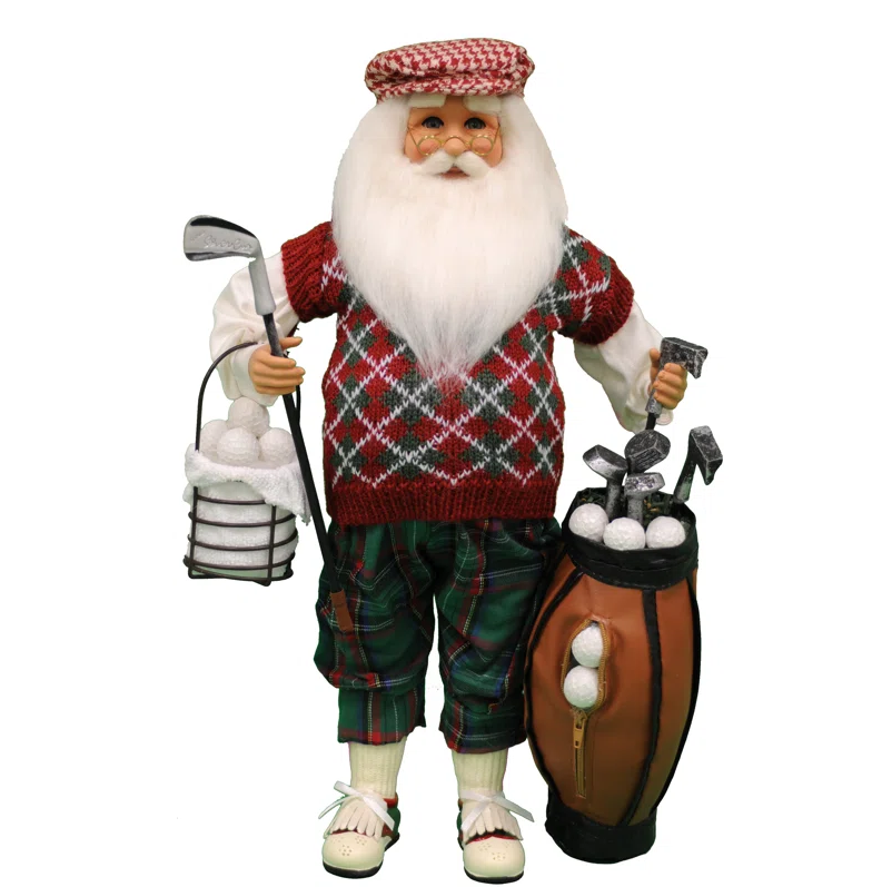 Our 17” Golf Santa with Basket is great for any shelf, office, and counter top. The quality is unmatched with this decorative piece’s hand-painted face, inset eyes, unique fabric, and detailed accessories. With his fun golf theme and original design, he’s perfect as a gift for the passionate golfer and he’s sure to add character and style to any home or office.