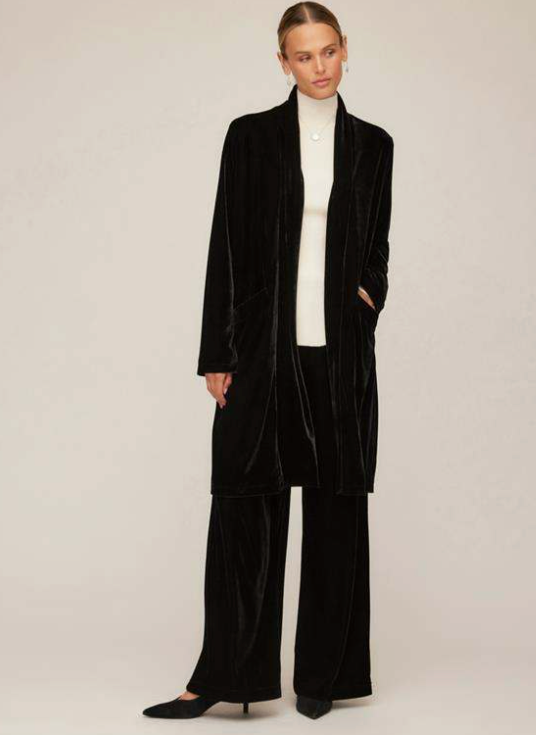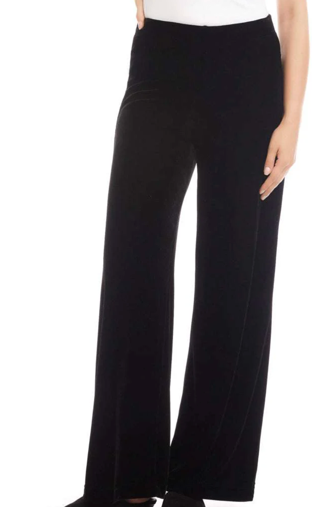 A sleek and versatile wardrobe essential, these pants are crafted from stretch velvet for a soft, fluid drape. Designed with a comfortable elastic waistband, they pull on easily and move with you. The wide-leg silhouette elongates the figure while offering effortless style, and the full-length cut makes them perfect for pairing with heels or flats. A chic choice for both day and evening looks.