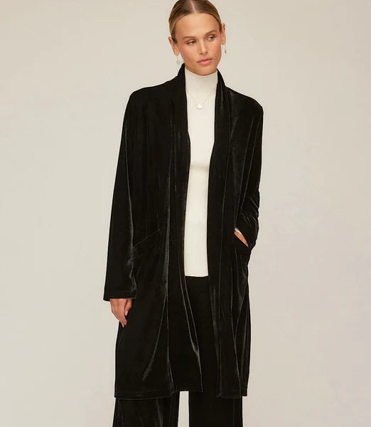 A luxurious layering piece with timeless elegance. Crafted from stretch velvet, this duster features a long-sleeve, open-front design that slips on effortlessly. Set-in sleeves and side slits add to the sleek silhouette, while two front pockets provide both function and style.