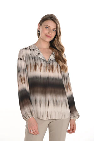 Expertly crafted with a blend of beige and brown hues, the Frank Lyman Spring Woven Top is a must-have addition to your wardrobe. Designed with the finest materials, this top offers both style and comfort. Perfect for any occasion, elevate your look with this Sophisticated Piece.