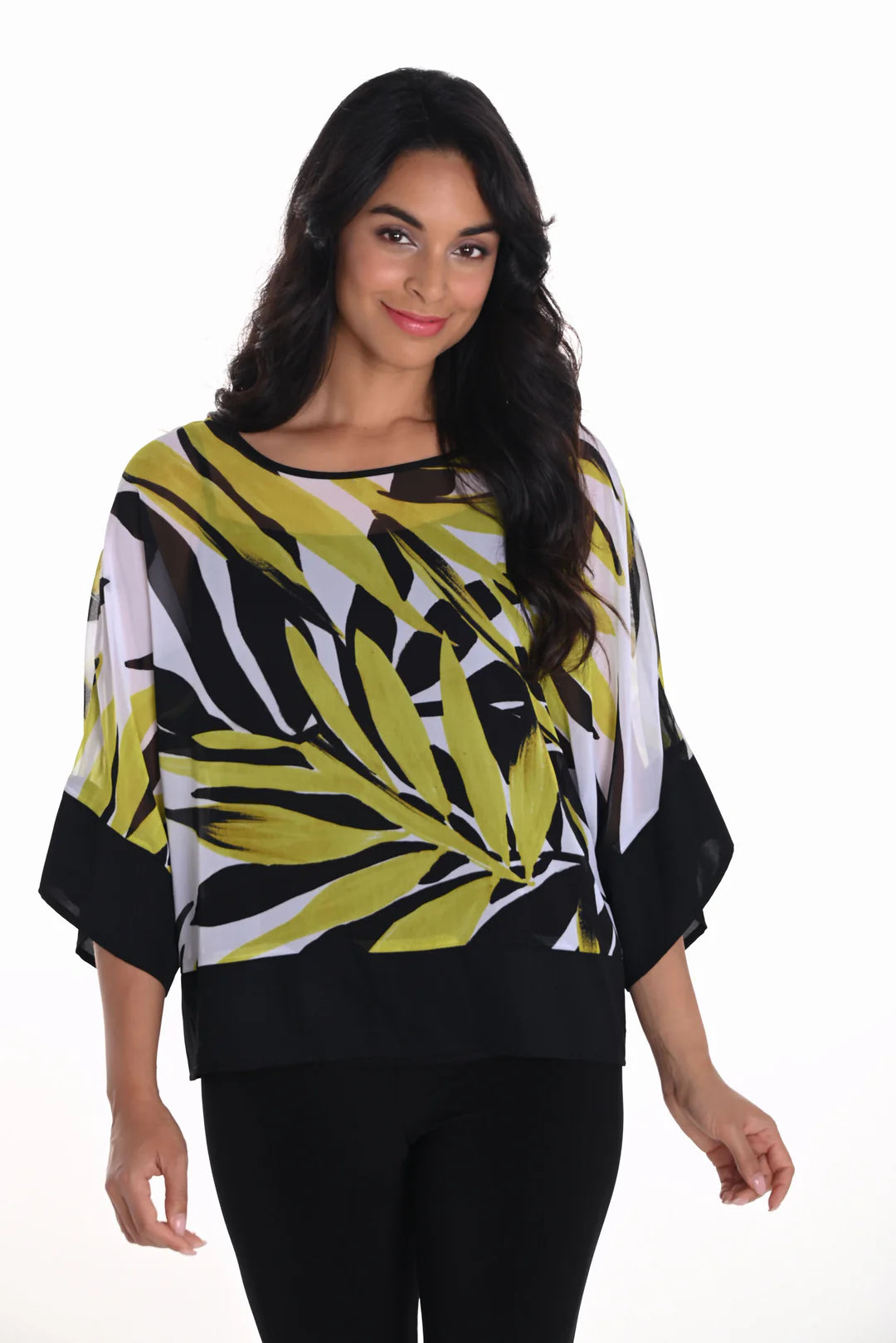 This Frank Lyman top is crafted from a luxurious woven and chiffon fabric, making it both comfortable and stylish. The leaf print adds a touch of nature to your wardrobe, while the 3/4 dolman sleeves provide a flattering silhouette. Perfect for any occasion, this top is a must-have for any fashion-forward individual.