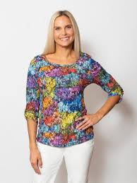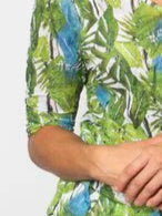 This top boasts a ballet-style neckline, tab sleeves, and a crinkled fabric, all finished with a straight hem.