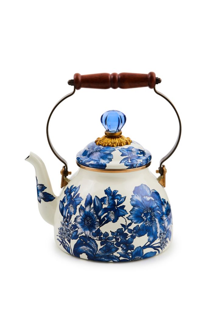 Heavy-gauge, hand-glazed steel underbody embellished with hand-applied transfers, rimmed in bronzed stainless steel. Wood handle. Lid is topped with a glass finial. Pieces may vary due to the handmade nature of each product. Imported.