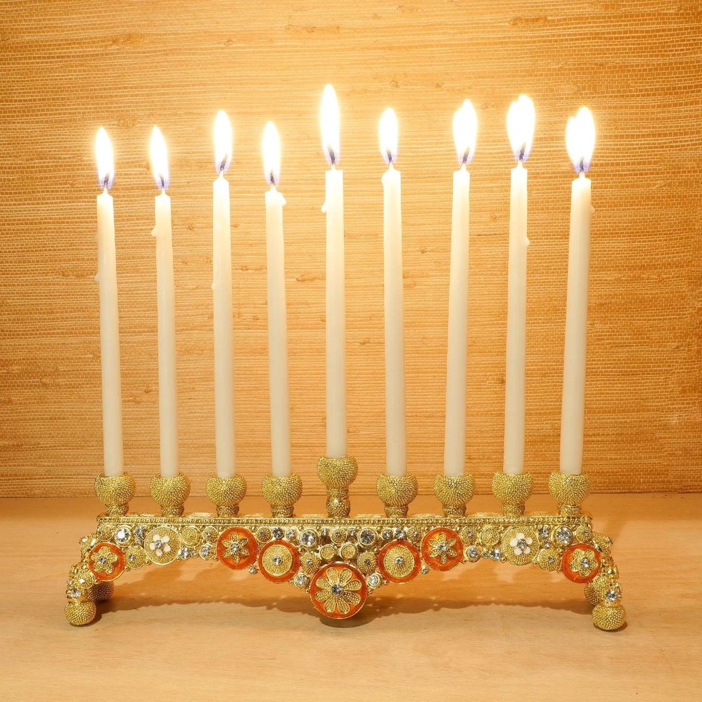 Gold finished pewter, with intricate orange and white hued hand-enameling. Encrusted with hand-set clear European crystals. Tarnish resistant. Signature luxury gift box included.