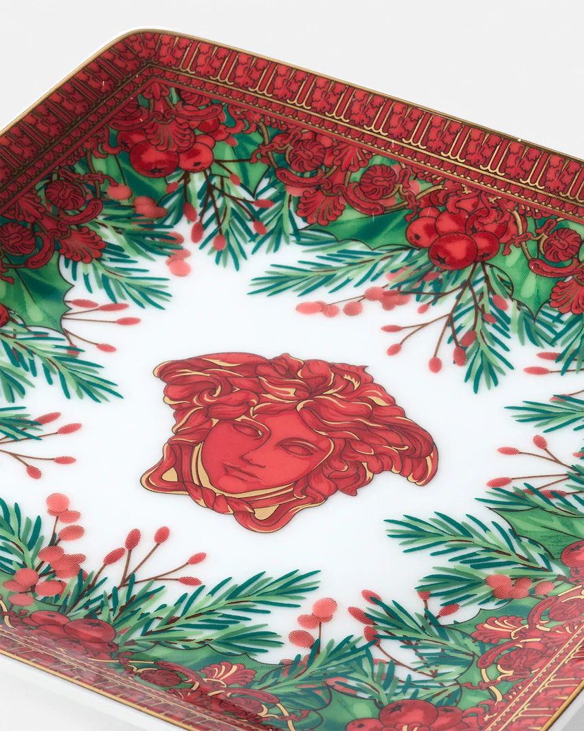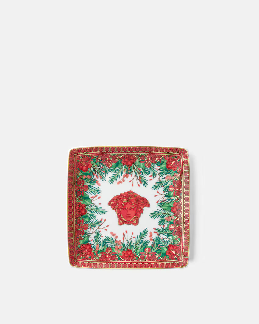 A squared plate from the Medusa Garland collection. This small porcelain item is ideal as a coffee or entryway table accent.