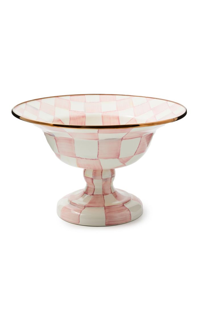 An indispensable party serving dish, the Rosy Check Large Compote is decorated with hand-painted checks in a range of rosy hues. It has a steel underbody and bronzed stainless-steel rim.
