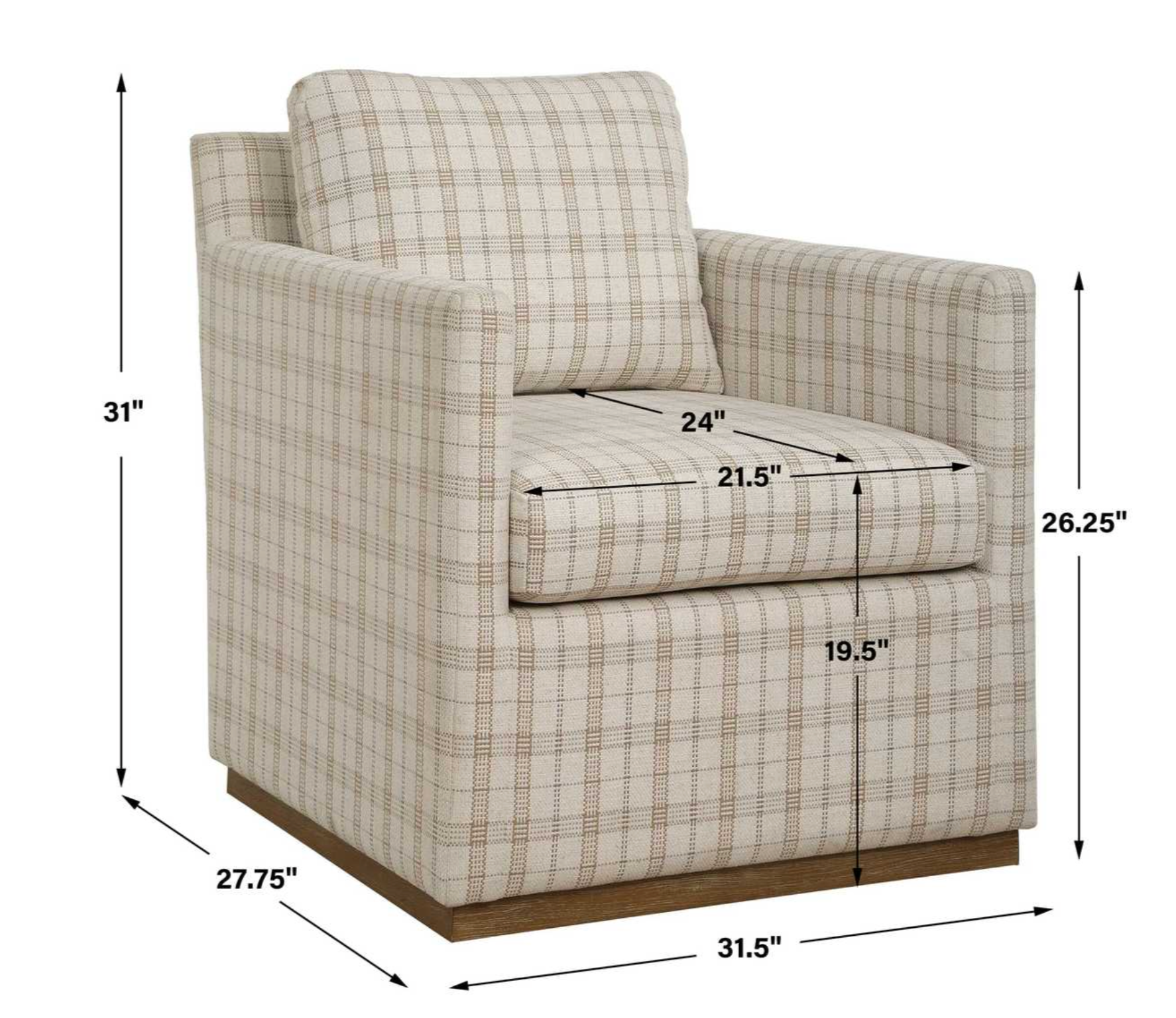 Experience effortless style and comfort with this swivel club chair featuring a solid wood plinth base in natural oak. Tailored in a casual linen blend plaid in beige and taupe tones.