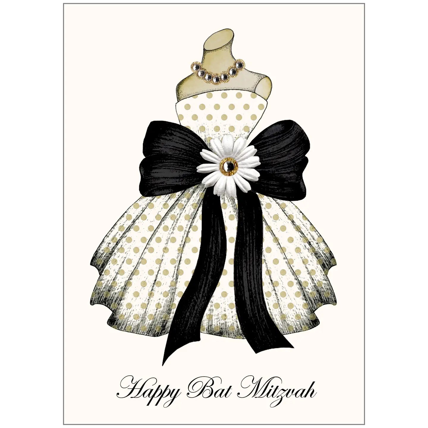 Cover: Happy Bat Mitzvah Inside: Mazel Tov Hand illustrated Hand embellished Size A7 Actual card size: 5" x 7" Ivory cards / Ivory envelopes. 100 lb. card stock Packaged in a protective clear sleeve