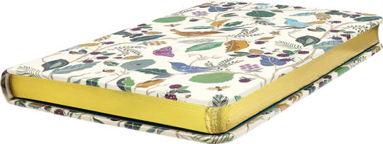 Elegant journal depicts a woodland tableau filled with birds, berries, botanicals, bees, a butterfly, and tiny snails!