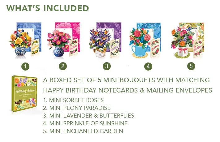 A curated boxed set of five mini bouquets with matching birthday notecards ensures you will always have something heartfelt on hand to celebrate someone's special day. Perfect for birthdays big or small, these blossoms bring color, cheer, and a wish for joyful beginnings.