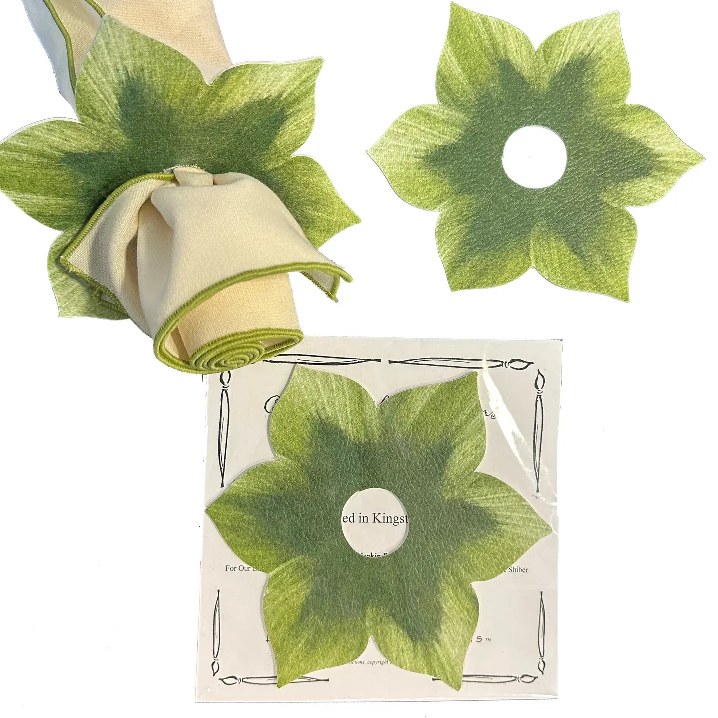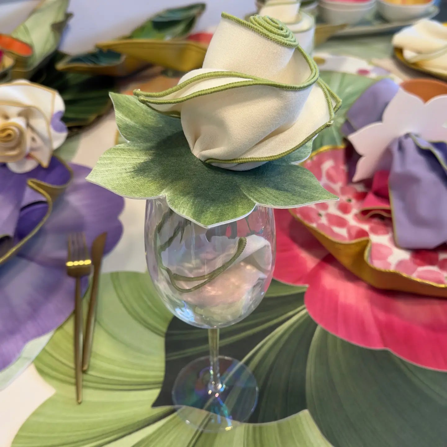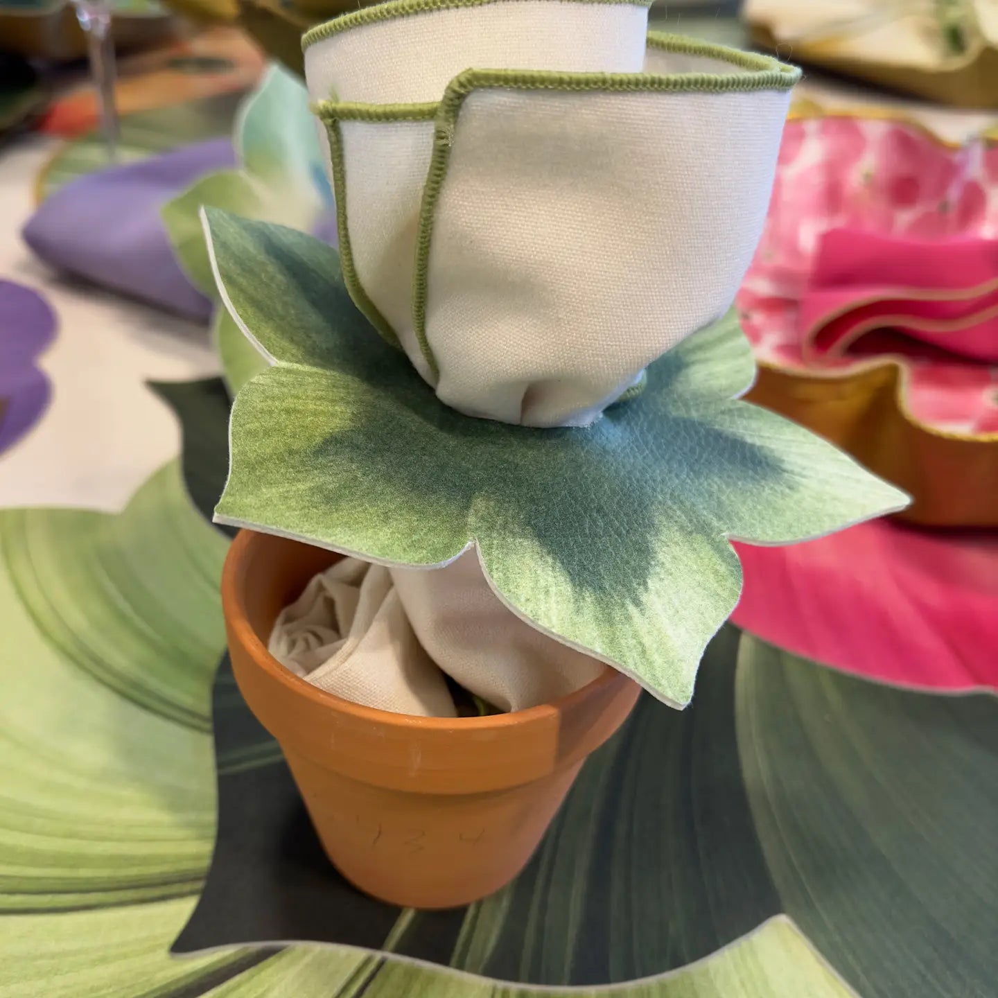 Beautiful hand-painted napkin rings designs that double as coasters! Turn napkins into flowers with our Botanic Hosta Leaf Napkin Ring-to-Coasters™. Printed from my painted versions, these easily become an extra special moment with your customer as you have fun rolling, and demonstrating how it works in glassware, clay pots, baskets or just on the table. Artfully printed on vegan leather (textured vinyl), these are great to simply scatter around the table! DETAILS: - 6.5" W - Sponge clean - Finely crafted by Leo in Chile - Luxurious and flexible vinyl - Can be used as napkin rings and coasters