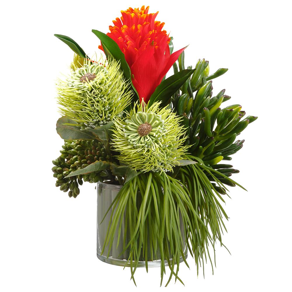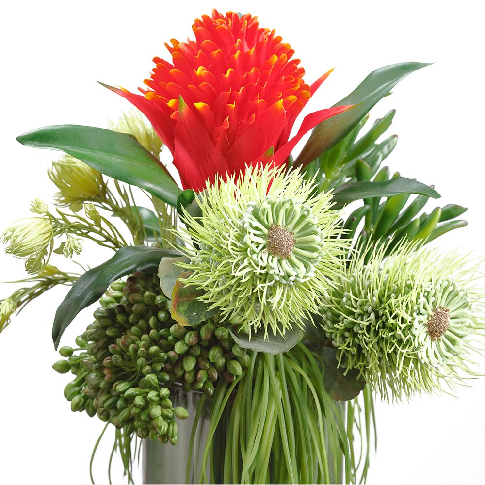 Indulge in the beauty of nature with our stunning Bromeliad and Succulent Grass on Glass. This exquisite piece features a 12-inch tall arrangement of vibrant red and green plants, expertly arranged in a sleek glass vase. Elevate any room with the luxurious touch of this unique and elegant piece.