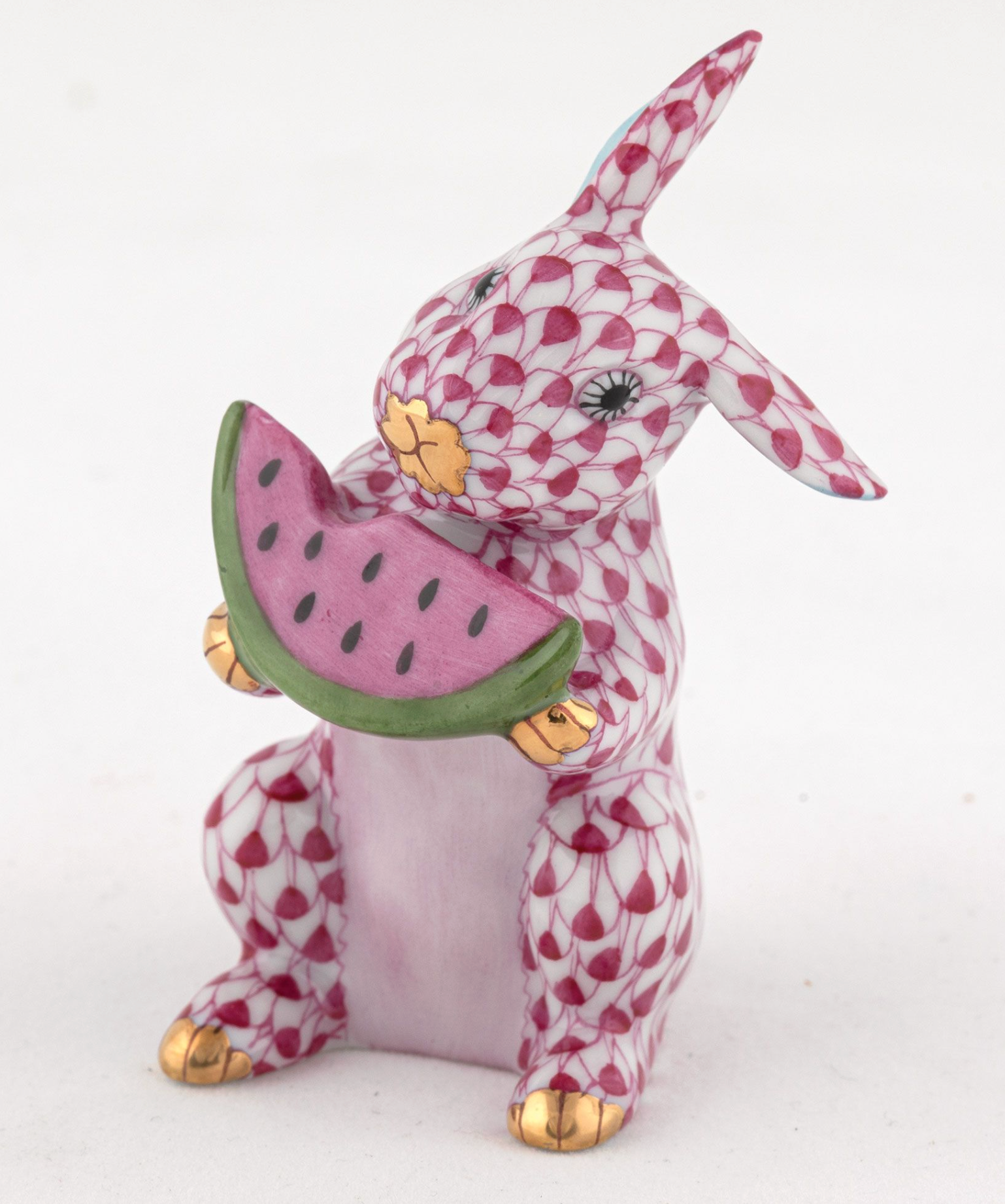 Charming ceramic bunny clutching a vibrant watermelon slice, a delightful accent piece for any collection. Measuring 1.5 inches long by 1.25 inches wide and standing 2.75 inches tall, this petite figurine captures whimsical elegance with refined detail. Perfect for shelf displays, garden arrangements, or as a thoughtful gift for collectors who appreciate artisanal craftsmanship and playful sophistication.