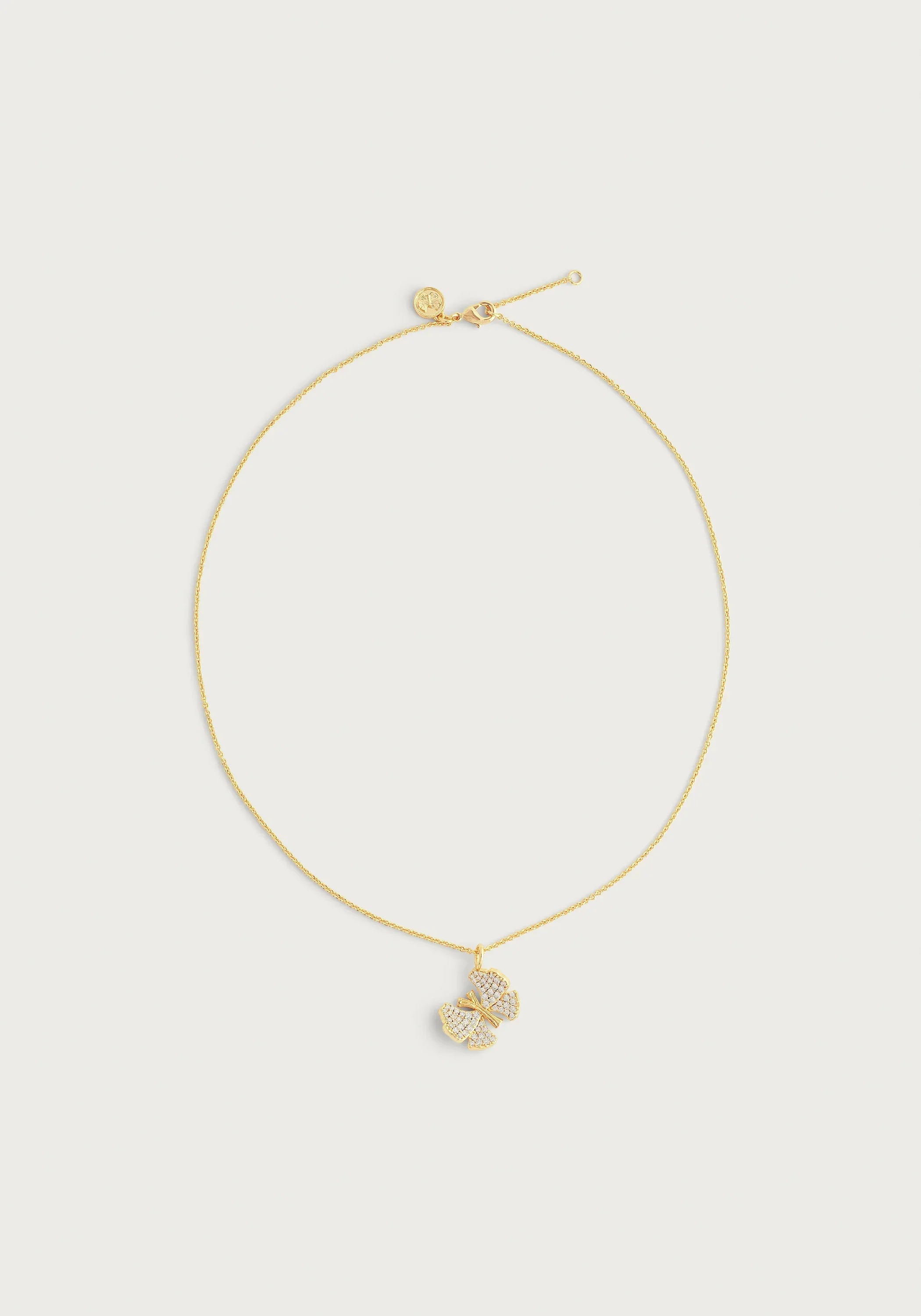 This necklace showcases a delicate butterfly charm crafted out of 18k gold dipped brass and is fully encrusted with shimmering crystals, making it a luxurious and fun-to-wear classic. Flutter your way into fabulous fashion with this butterfly pavé necklace. Adorned with dazzling crystals, it brings a touch of luxury and playful charm to any outfit.