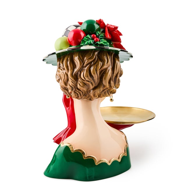 Add MacKenzie-Childs signature charm to your Christmas season with the Check It Out Lady Butler. Wearing a poinsettia-topped Courtly Check and stripe hat, this elegant figurine holds out a gold tray that's perfect for holding holiday goodies or displaying more Christmas decor. Beautiful on the countertop or end table for a cheerful holiday display.