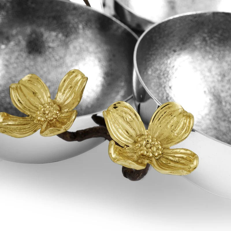The Dogwood Triple Bowl is a striking blend of artistry and nature. Handcrafted in stainless steel with oxidized brass branches and white enamel petals, it captures the graceful essence of the dogwood tree. Ideal for entertaining or display, it brings refined, organic beauty to any space.