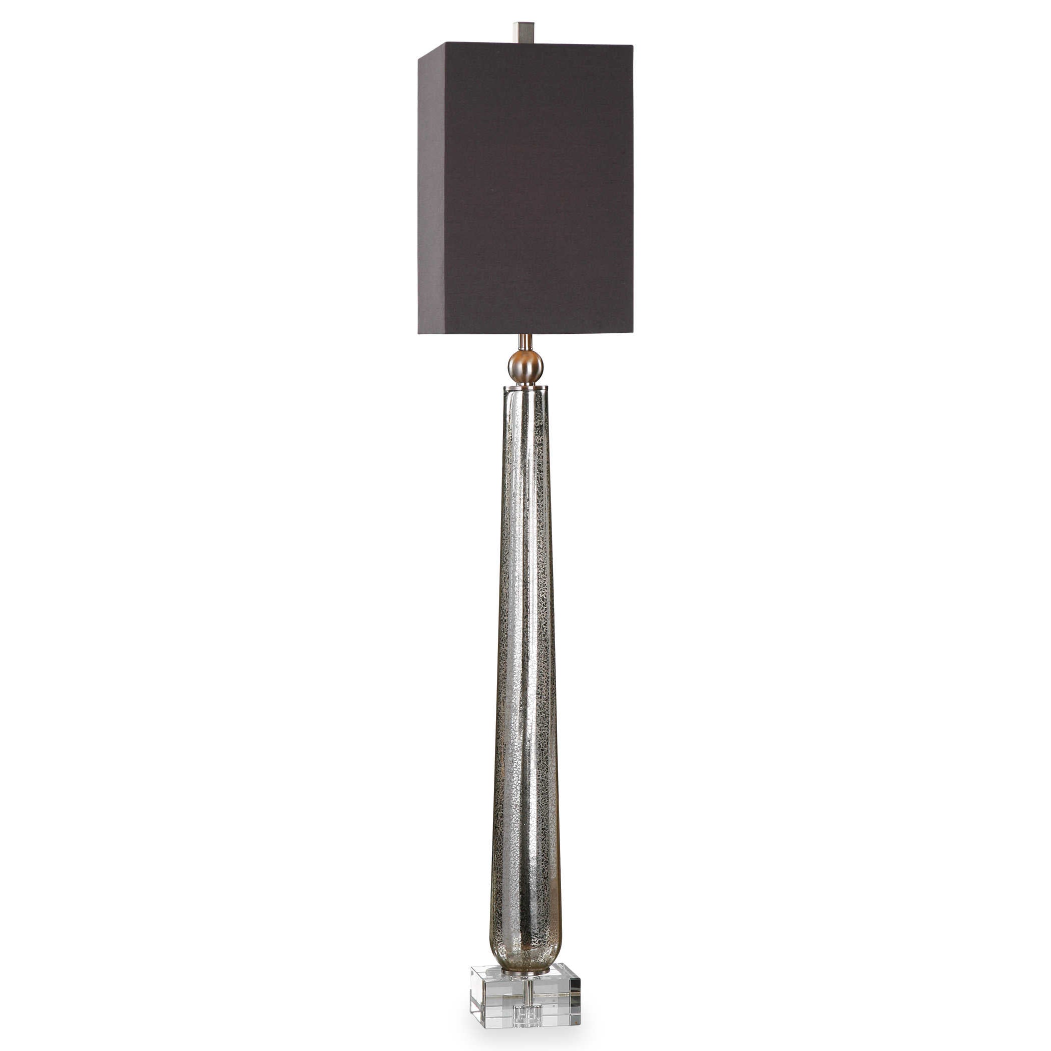 Tall tapered mercury glass with a subtle ribbed texture accented with brushed nickel plated details and a crystal foot. The square hardback shade features charcoal gray linen fabric with natural slubbing.