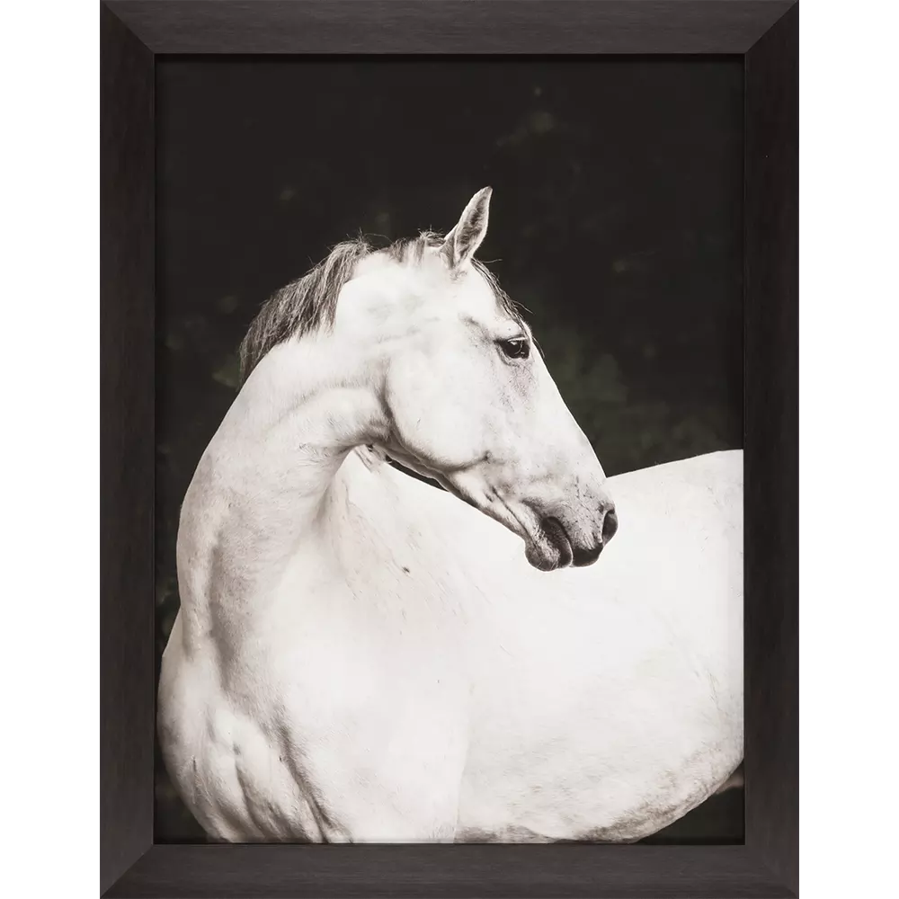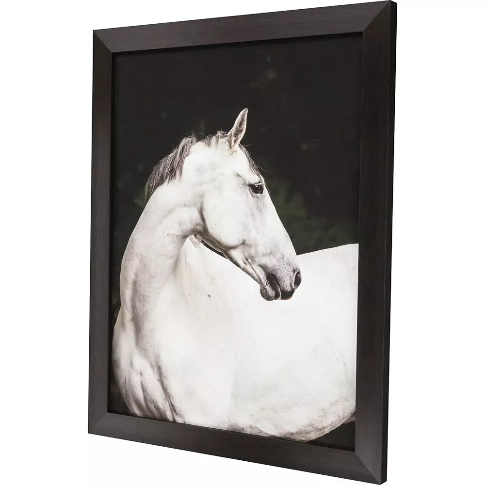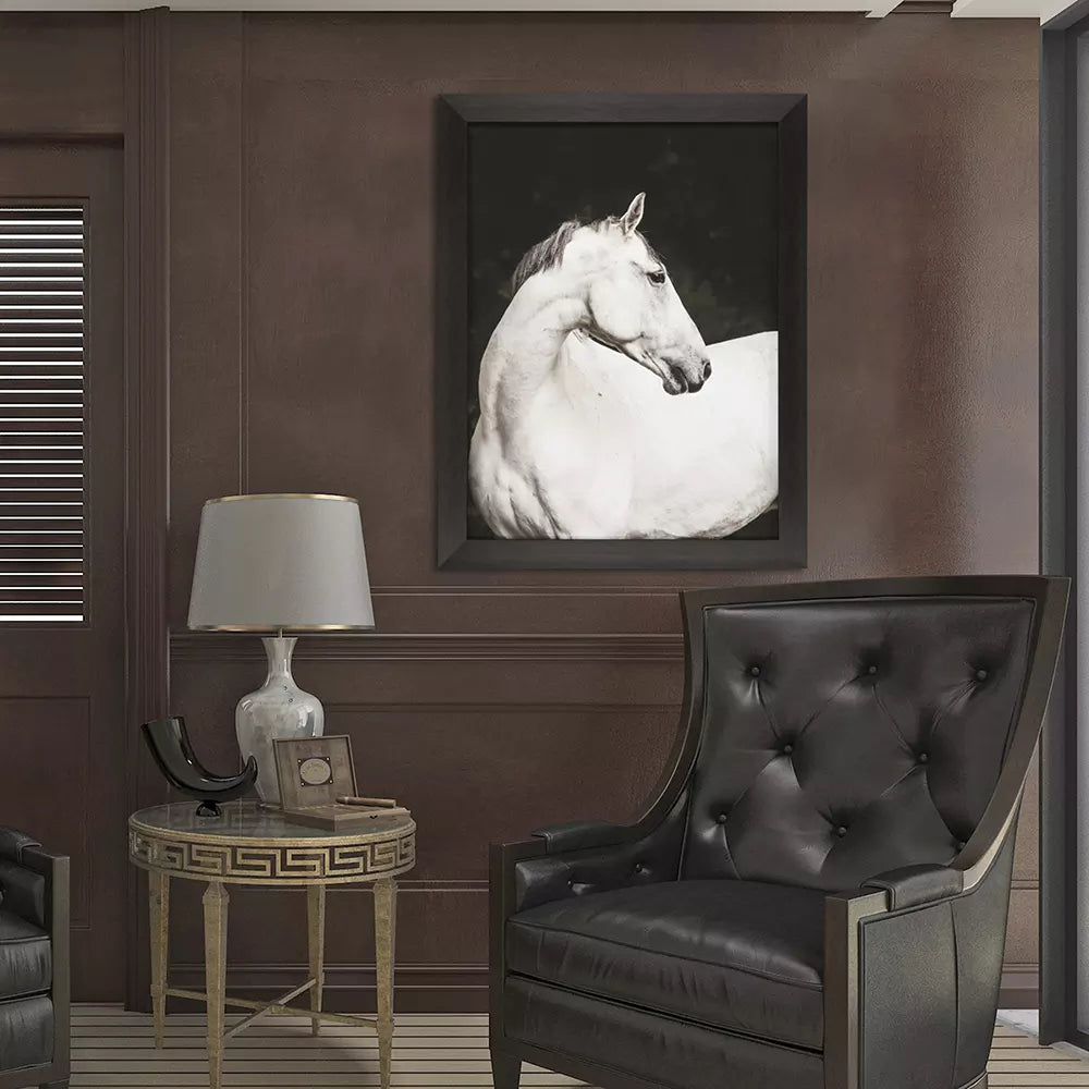 A noble steed commands attention. Framed in a block profile moulding in a dark wood finish.