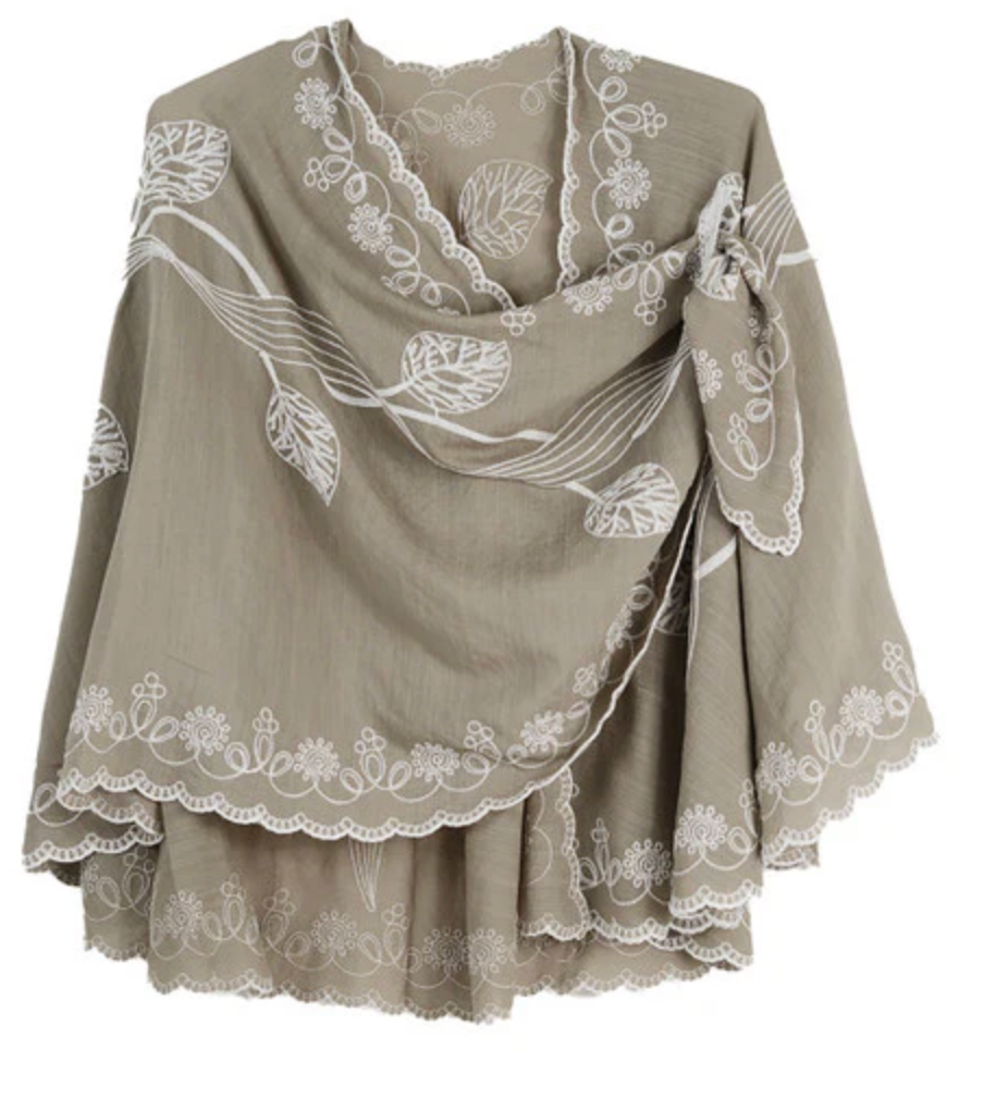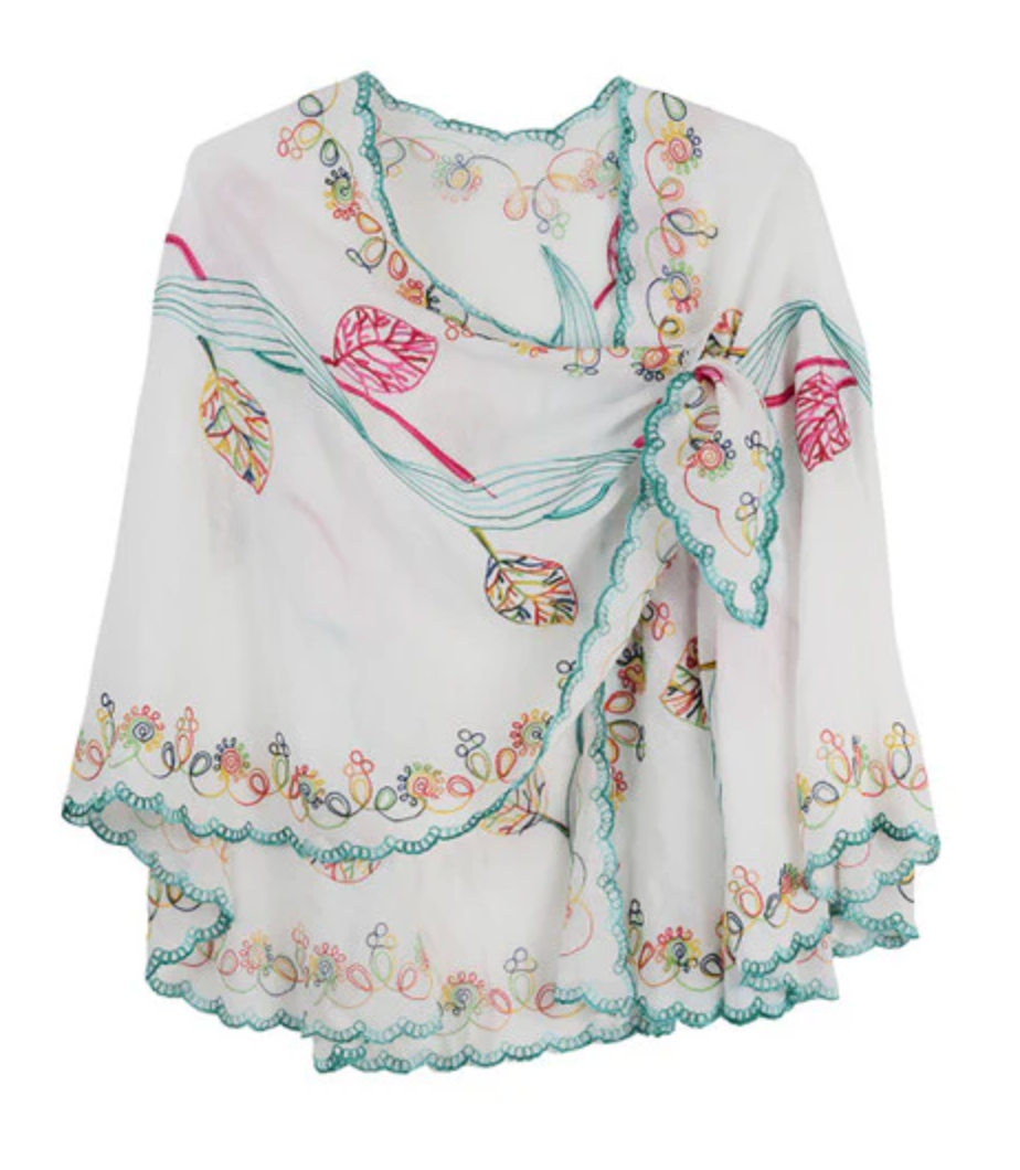 Crafted from 100% lightweight cotton, this embroidered shawl combines effortless elegance with artisanal detail. Intricate embroidery adorns the fabric, while a sewn-in loop ensures it drapes beautifully every time. Versatile across seasons—perfect for spring, summer, and fall—this one-size-fits-all piece transitions seamlessly from day to evening. Its timeless appeal makes it an exceptional gift, and you'll find yourself reaching for it in every color.