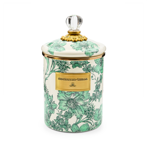Heavy-gauge, hand-glazed steel underbody with hand-applied transfers, rimmed in bronzed stainless steel. Brass and glass accents. Silicone seal inside lid. Pieces may vary due to the handmade nature of each product. Imported.