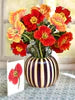 he poppy is a flower that glimmers with hues of tangerine, copper, and ruby reds, representing peace, remembrance, and luxury. This stunning bouquet, elegantly arranged in a stylish striped vessel, is the perfect gift for the unique and creative people in your life. Overflowing with warmth, vibrancy, and meaning, it's sure to leave a lasting impression.