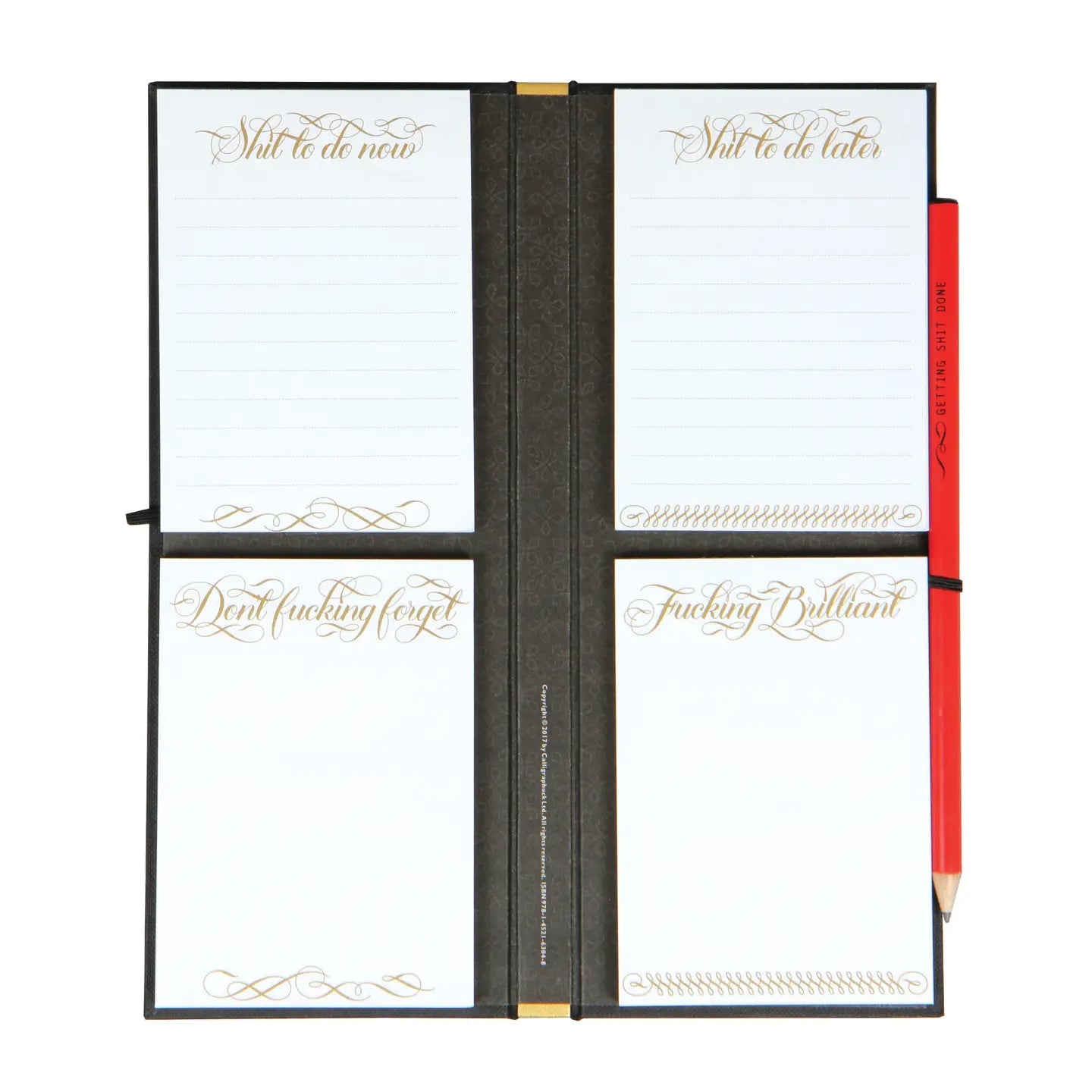 With a gold foil-stamped cover and spine, four notepads for notes and to-dos, a coordinating pencil—and amusing expletives throughout—this hardcover ledger is a great organizational tool for anyone with a sense of style and humor!