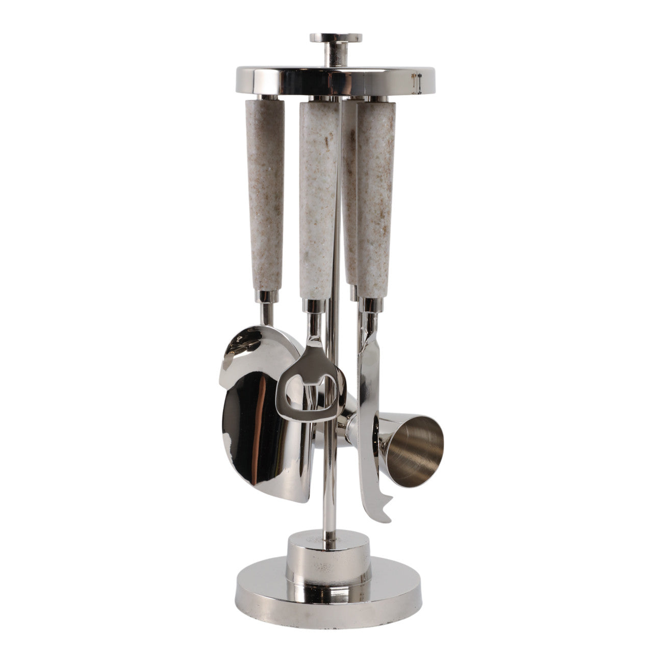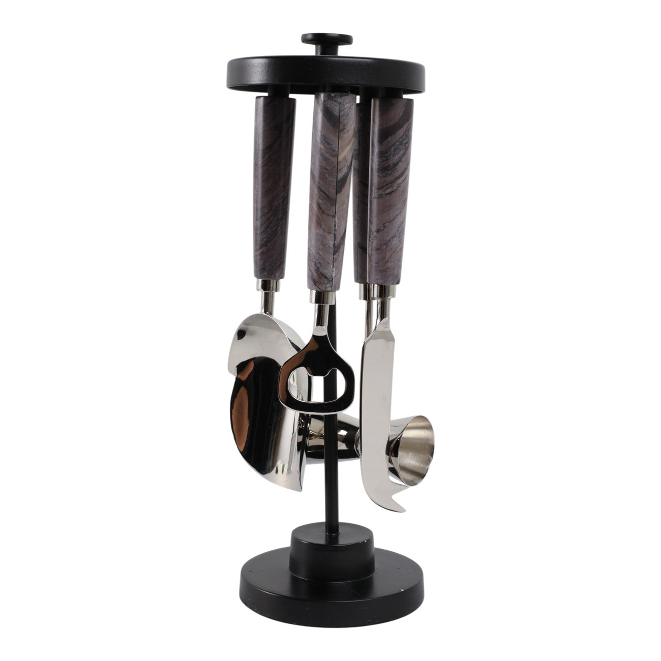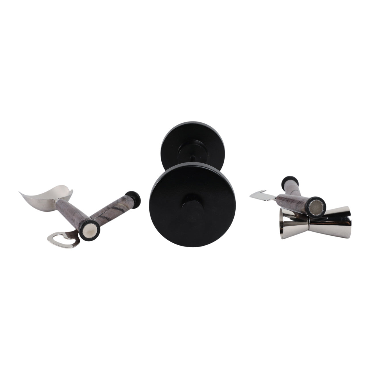 Elevate your home bar with the Guymon Bar Tool Set, a sophisticated blend of modern and transitional design. Crafted from durable steel and natural stone, this sleek black set combines functionality with contemporary elegance. Weighing just 3 lbs and measuring 4 x 4 x 13 inches, it's the perfect compact addition to any bar cart or counter. Whether you're a cocktail enthusiast or casual entertainer, this versatile tool set brings professional-grade style to your mixology experience.