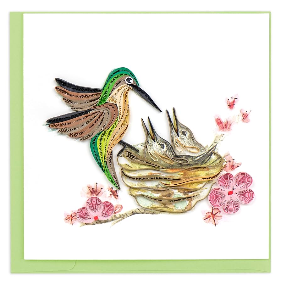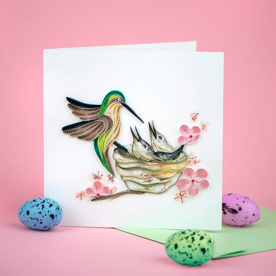 Share a quilled Hummingbird and Babies greeting card with your friend or loved one for any occasion! This card is perfect for Mother's Day or simply during spring. The design includes a green and brown hummingbird fluttering next to her nest with two babies. The nest sits on a branch with pink flowers.