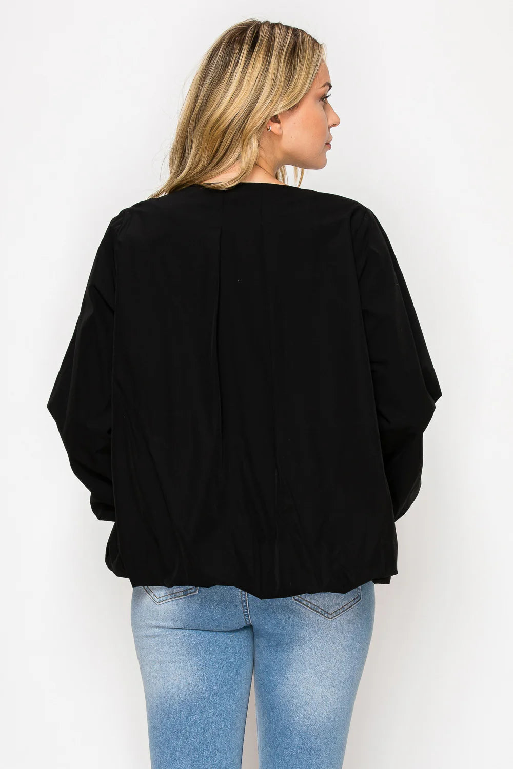 The Jaylan. A classic and lightweight windbreaker type jacket made with high quality stretch woven parachute. Elastic balloon sleeves. Tucked hem to create detail and volume. Zipper tassels. Stylish and timeless.