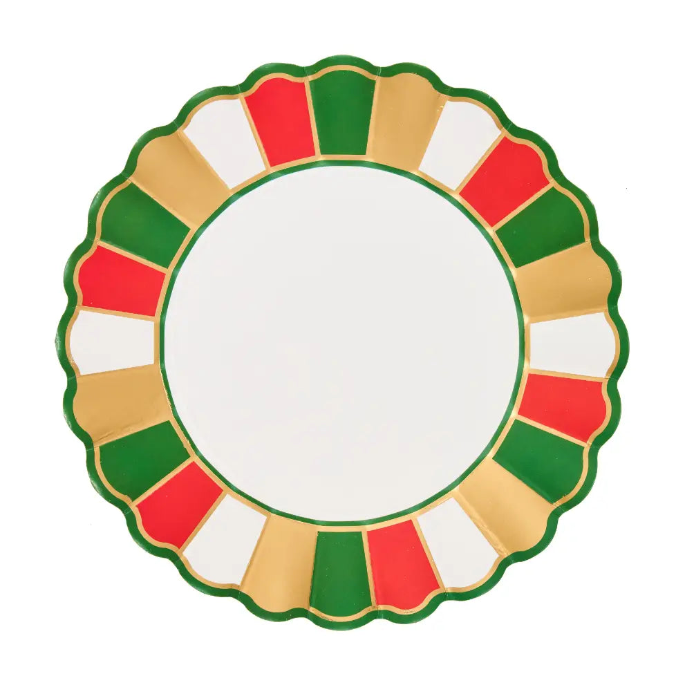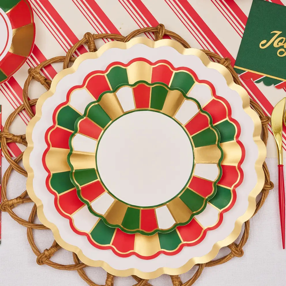 These scalloped-edge salad plates from our Joyful Christmas collection feature alternating borders of red, green, and gold with a clean, solid white center. With their bold holiday colors and elegant foil accents, they’re perfect for bringing festive cheer and sophistication to your Christmas celebrations. These plates are both durable and disposable, allowing you to skip the dirty dishes, without sacrificing quality and style. Your guests will never believe they’re disposable! • Quantity: 1 pack of 8 plates. • Material: Paper • Size: 8" round. Perfect for salads, side dishes, cake, and more!
