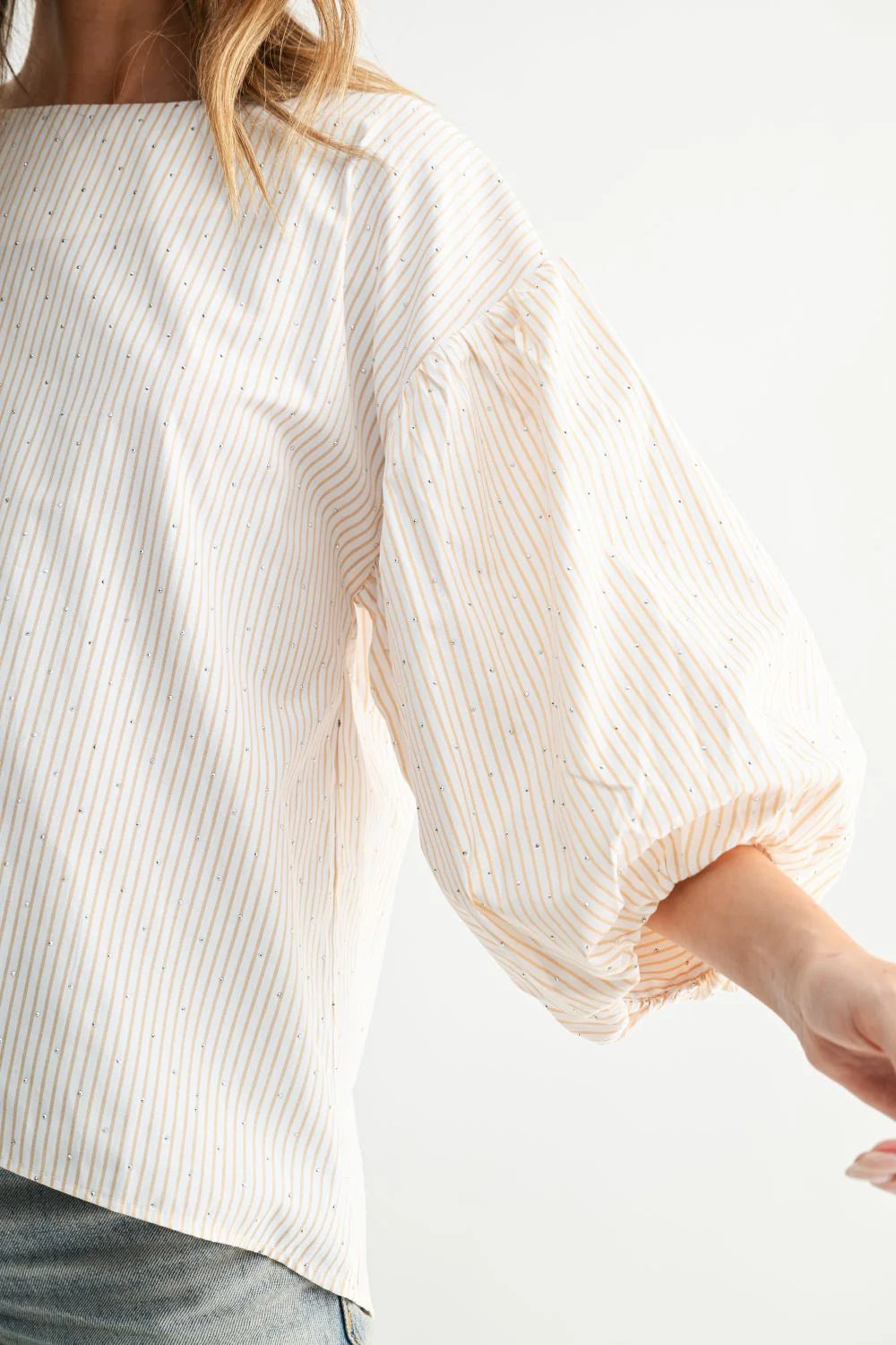 This striped woven cotton poplin top features subtle rhinestone accents and voluminous balloon sleeves for an effortlessly feminine look. Its relaxed silhouette and soft cotton feel make it a perfect blend of comfort and style—easy to dress up or wear casually.