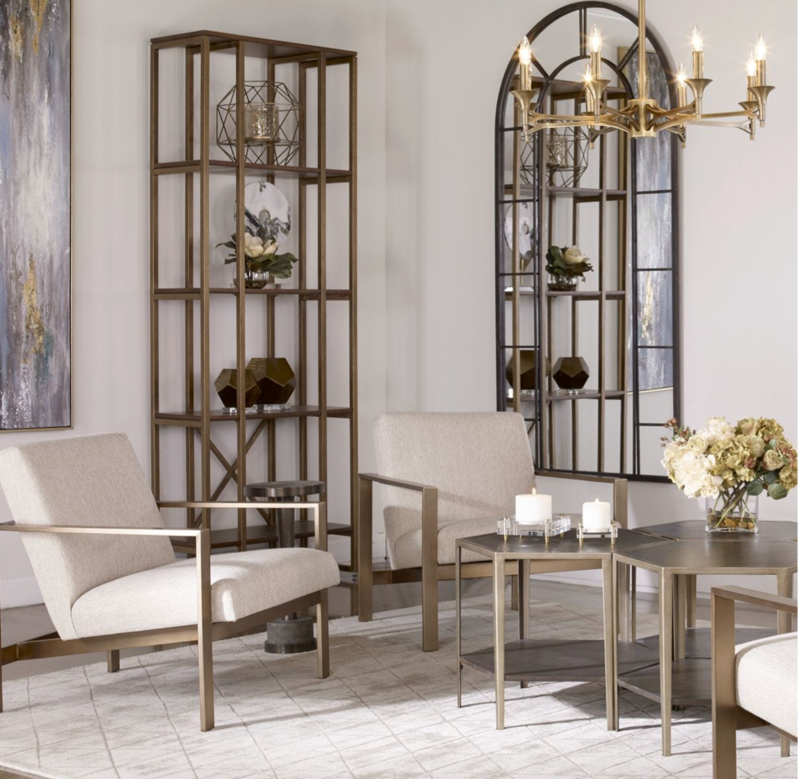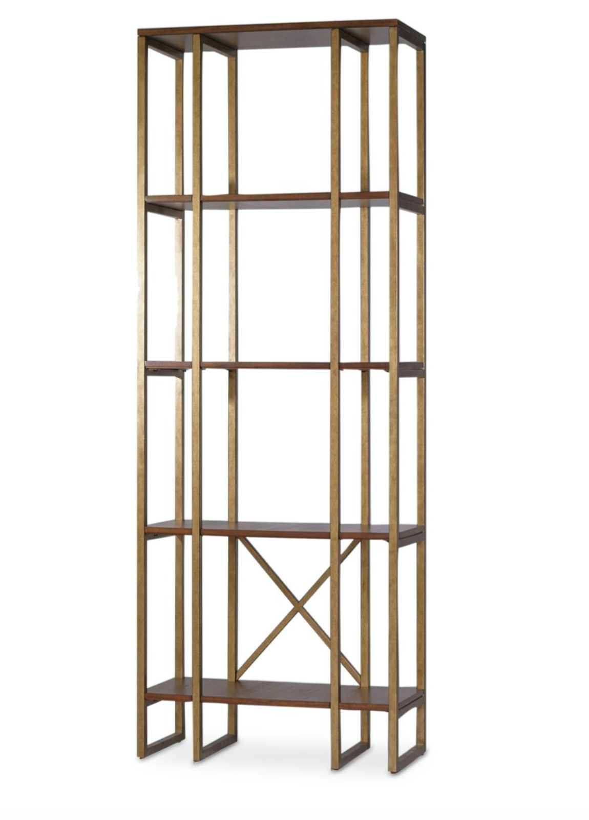 Easily display items on this transitional etagere, finished in a brushed antique gold and accented by four acacia veneer fixed shelves in a rich dark walnut stain.