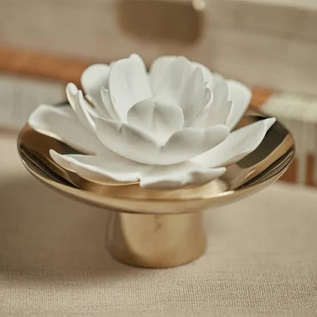 Enlightening. Elegant. Eye-catching. This lovely scent diffuser is a subtle way to softly fragrance a room all day. It comes in our gorgeous gold tone ceramic container with a floral porcelain topper that wicks and diffuses fragrance-no reeds required, and beautifully boxed.