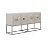 This attractive console meets all your 21st century technology needs in a vintage-inspired style that suggests the iconic glamour of Paris. This unique console features mixed materials including a luxurious stone top, maple veneer finished in dove gray, antiqued mirror accents and an open metal frame. Four doors reveal two adjustable shelves and plenty of storage for media, accessories, and all your other entertainment essentials.