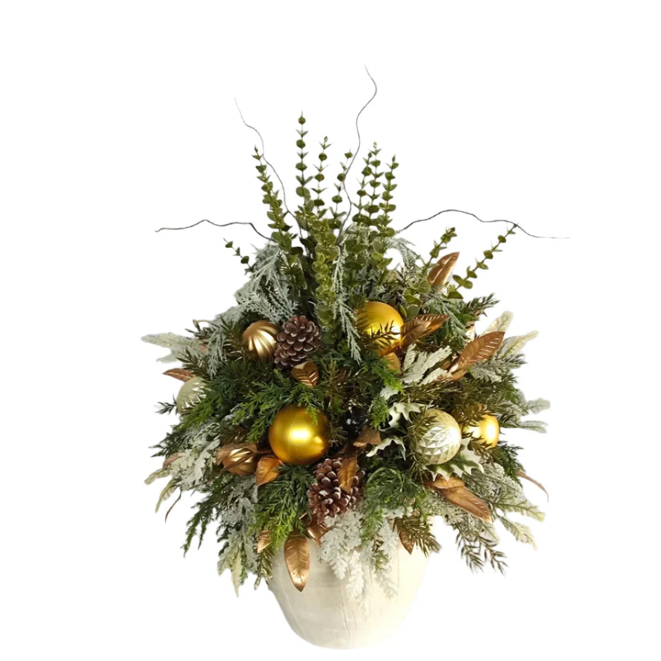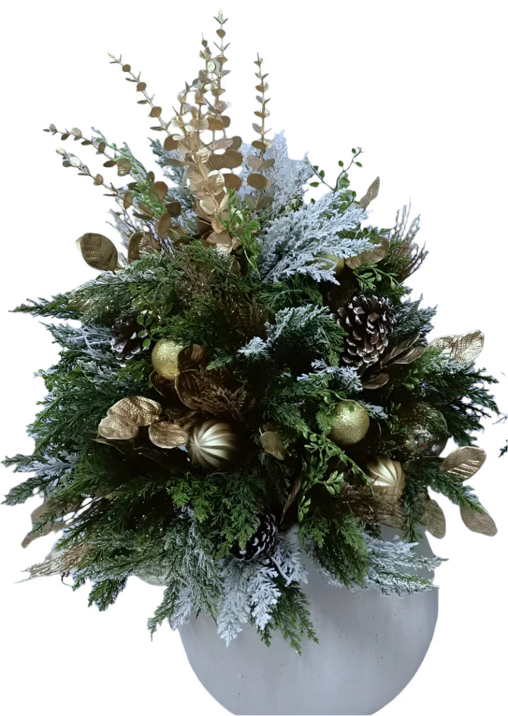 Create a luxurious and sophisticated atmosphere with our Mixed Cedar Potted Arrangement. This stunning piece features a mix of cedar, eucalyptus, and ornamental greens, bringing the beauty of nature into your space. Perfect for adding a touch of elegance to any room, this arrangement is sure to impress.