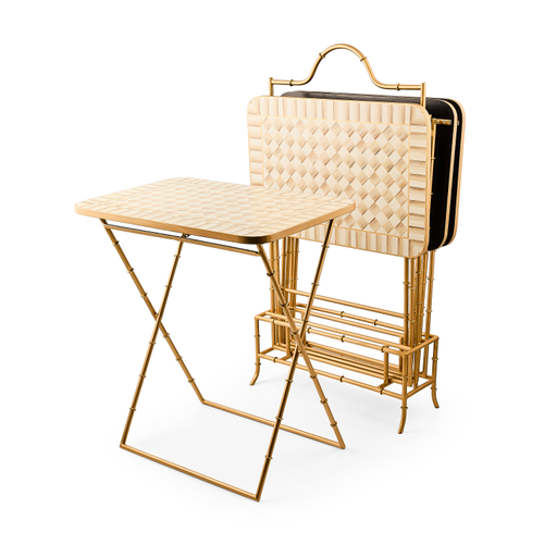 Iron and hand-painted engineered wood. Includes four trays and stand. Pieces may vary due to the handmade nature of each product. Imported.