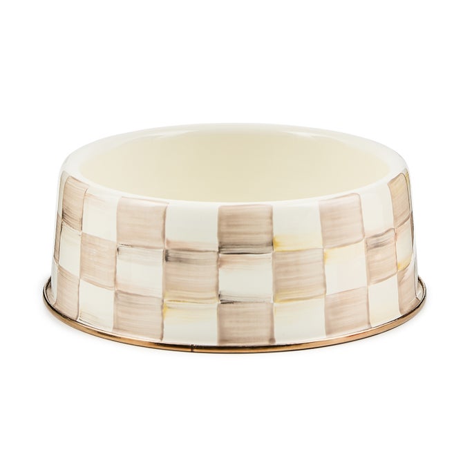 Our Check Pet Dish is hand-painted, with a heavy-gauge steel underbody and bronzed stainless steel rim.