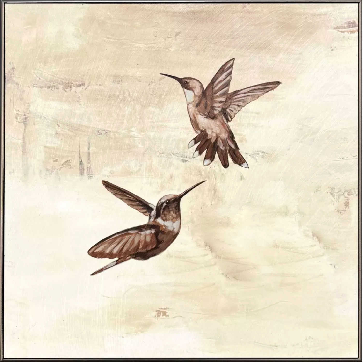 Hummingbirds take flight on a neutral backdrop with a hand applied enhanced gel finish overlay. Dimensionally framed in a metallic bronze moulding.
