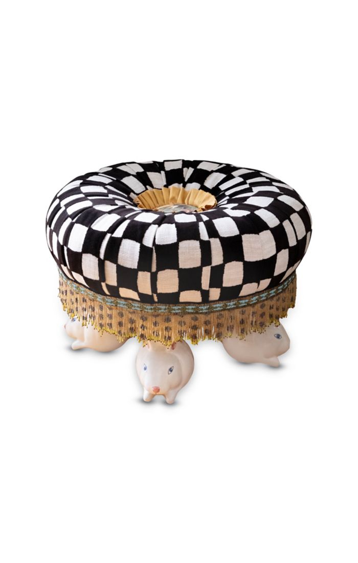 Add a whimsical touch to your space with the Rabbit Warren Tuffet. Upholstered in a soft cotton-poly blend, it features a charming silk pleated ruff, linen-covered button, and delicate beaded fringe. Handmade in Aurora, each piece is uniquely adorned with decorated majolica rabbit feet, making every tuffet delightfully one of a kind. Perfect for cozy corners or playful accents, this petite tuffet measures 21.5" in diameter and stands 15" tall. Embrace comfort with a dash of bunny-inspired charm!