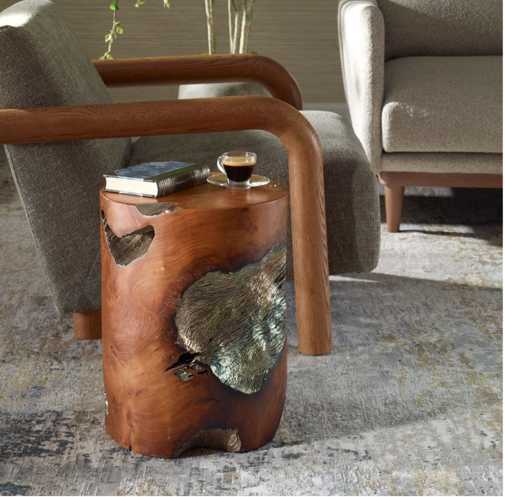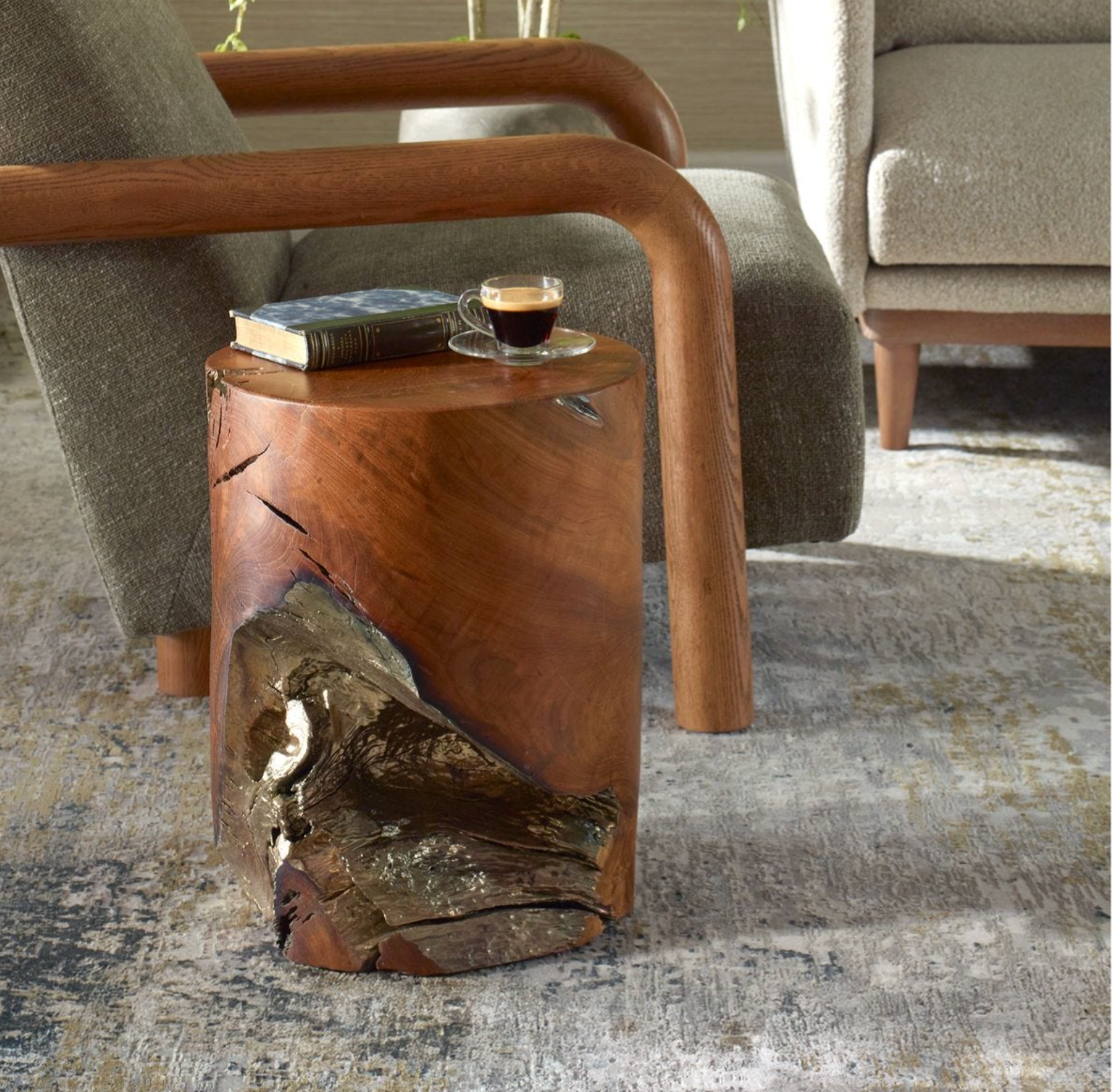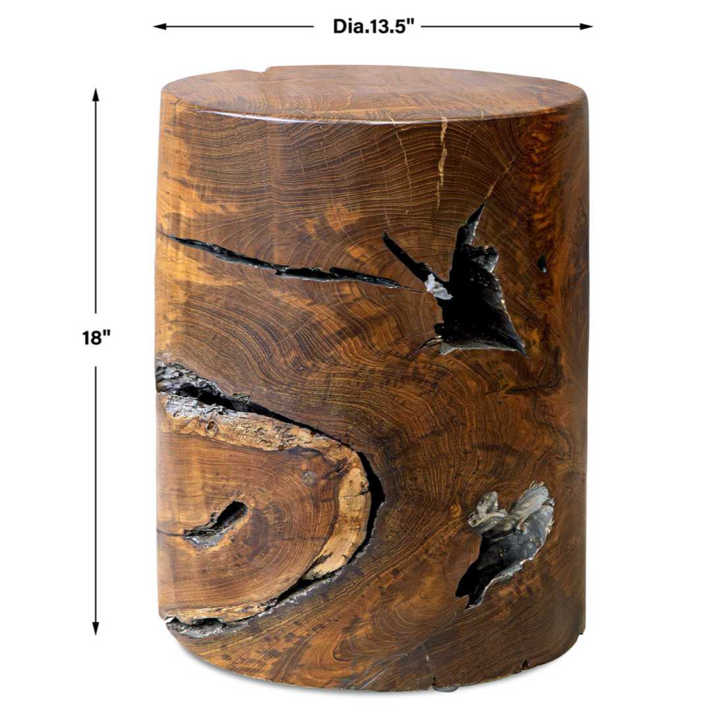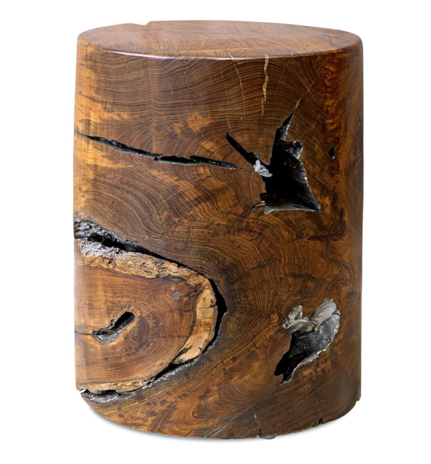 Crafted entirely from teakwood, this accent stool showcases dramatic spalting, beautifully accentuated by the natural teak finish and is complemented by antique silver-finished imperfections peaking throughout the piece, adding character to its design. Solid wood will continue to move with temperature and humidity changes, which can result in cracks and uneven surfaces, adding to its authenticity and character.