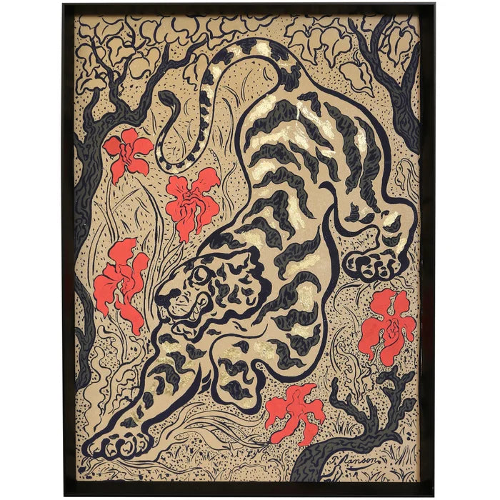 Bring wild charm to your space with this framed print featuring a majestic tiger surrounded by vibrant red flowers. Crafted in the USA, its 31-inch wide by 41-inch tall design adds bold color and playful energy to any room. Protected under glass, this striking artwork is ready to brighten your walls with a spirited touch.