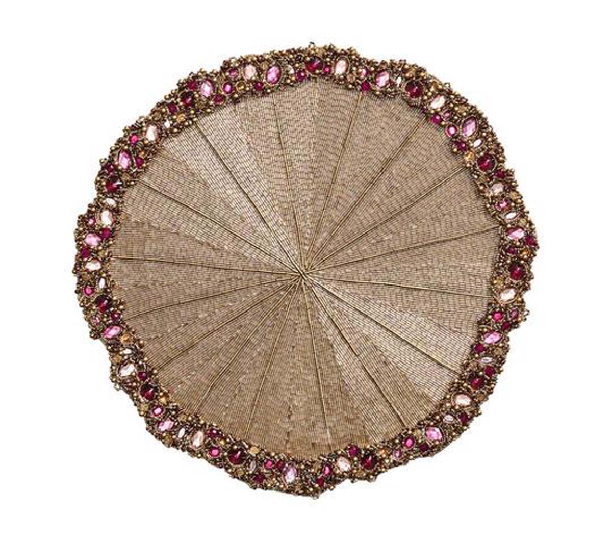 The Regent Placemat is a sophisticated round placemat in a rich gold hue. This round beaded placemat features a band of over 15 different styles of beads, sequins and gemstones in light pink to deep red jewel tones. This festive gold round placemat with intricate beading boasts old-world charm that works well for a formal or fancy table setting for the holidays or any special occasion.